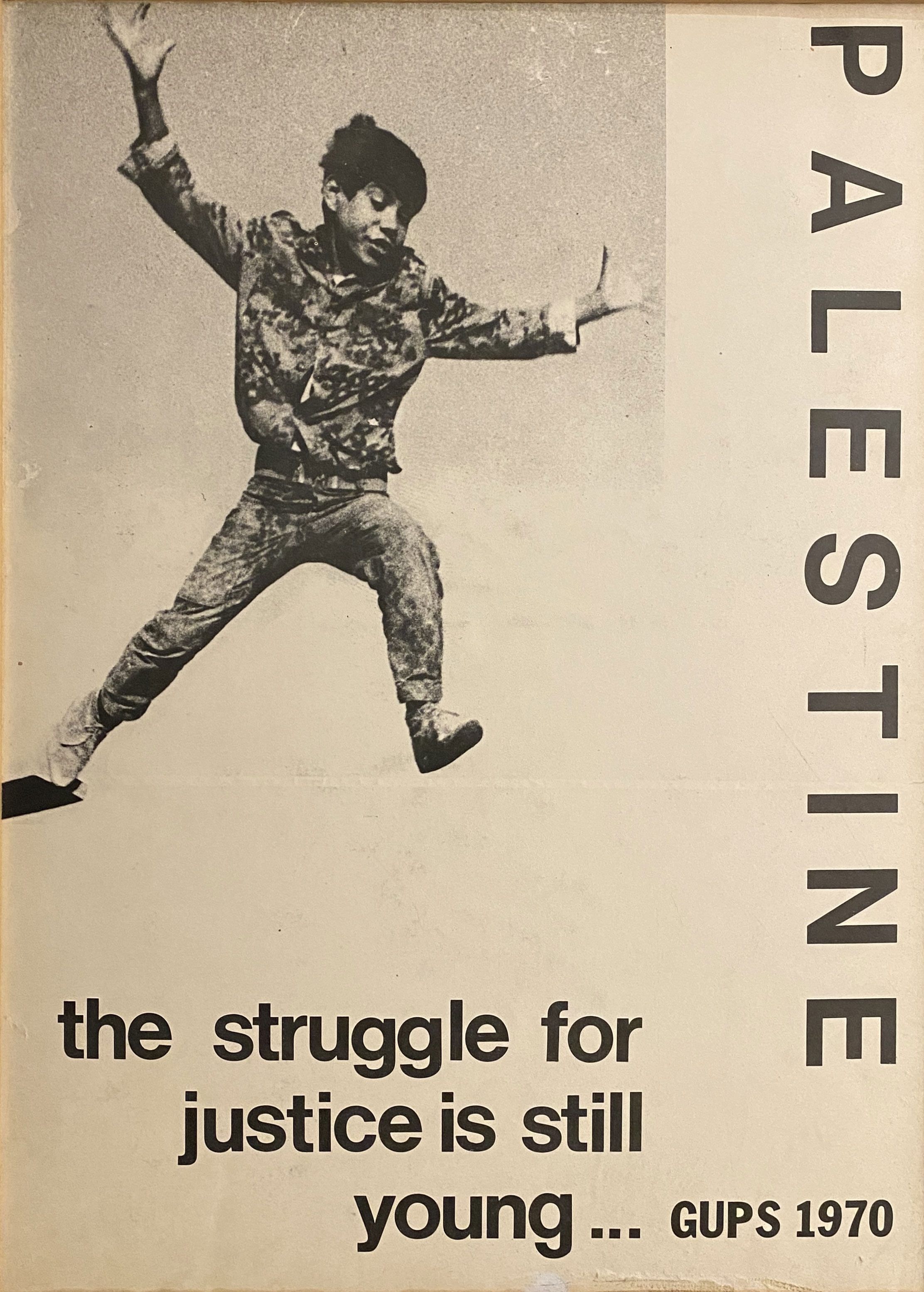 A poster, published by the General Union of Palestinian Students in 1970, features a photograph of a boy leaping in the air with his arms stretched wide open and is captioned, "The struggle for justice is still young... GUPS 1970".