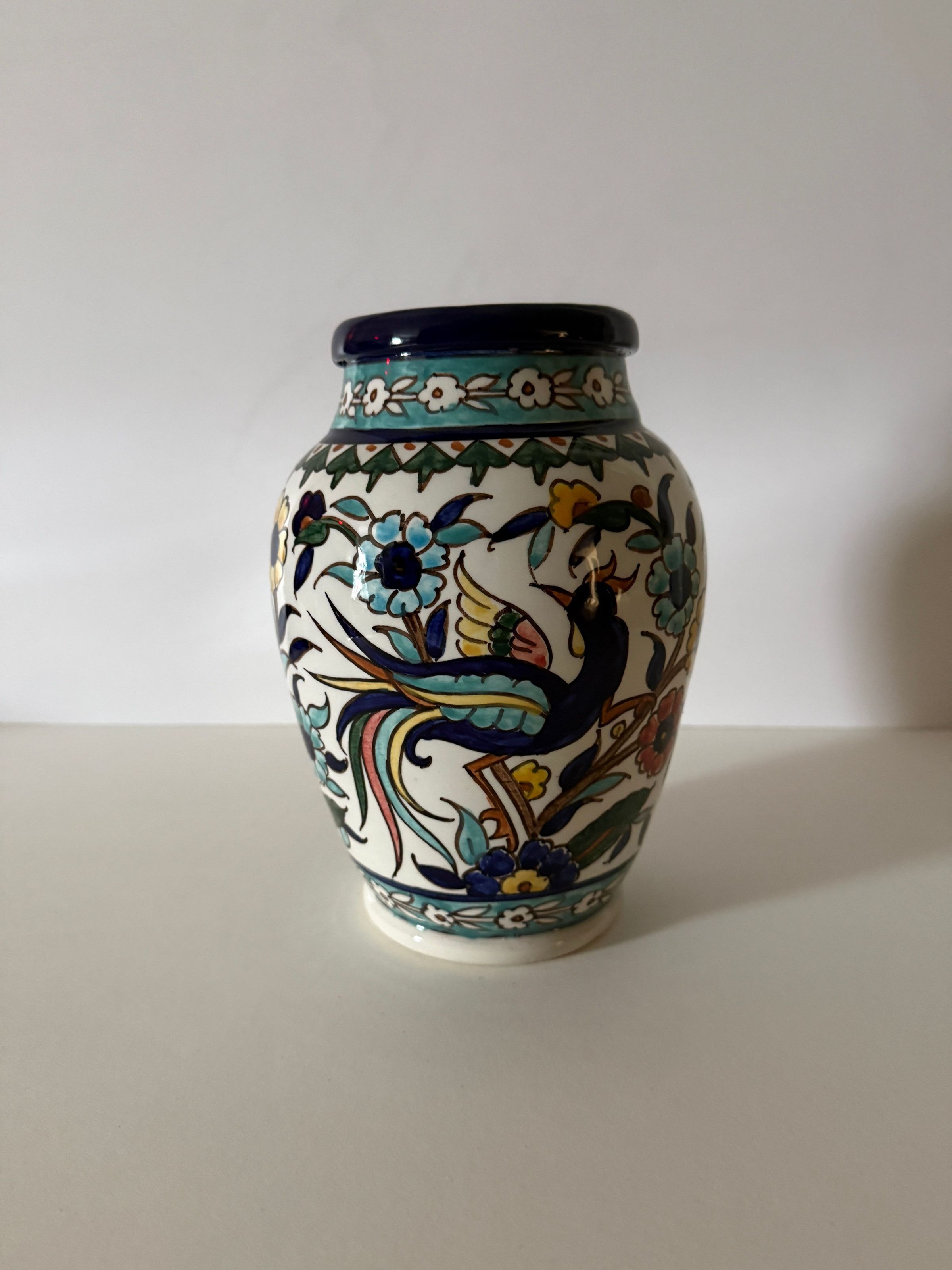 The vibrant Armenian ceramics found throughout Jerusalem’s old city represent a unique style of pottery born over a century ago and appreciated by the city’s diverse populations. Armenian ceramic artistry flourished under the British Mandate. Jerusalem Armenian ceramicists include David Ohannessian, (1884 - 1953) who established pottery in Kütahya in 1907 and is credited with establishing the Armenian ceramic craft industry in Jerusalem, as well as the Balians who came to world famous attention in 1992 when the Smithsonian Institution paid tribute to Marie Balian's work with an exhibition titled "Views of Paradise".
