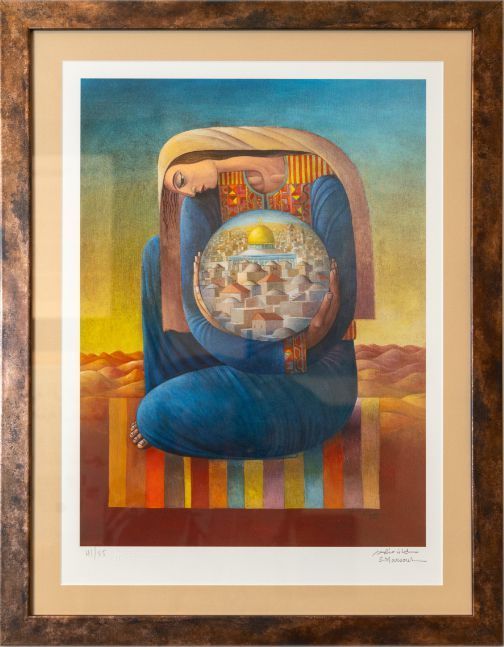 Using symbols derived from Palestinian life, culture, history, and tradition, Mansour uniquely illustrates Palestinians’ resolve and connection with their land. His pieces epitomize art as a form of resistance. With orange trees, he represents land lost in the Nakba of 1948. With olive trees, he represents land occupied in 1967. With women wearing traditional embroidered dresses, he represents Palestinian land and the Palestinian revolution. With the landscape of Palestine and its stone terraces, he represents the mark of Palestinian farmers on the land. With images of Jerusalem and the glistening Dome of the Rock, he represents the Palestinian homeland and the dream of return.