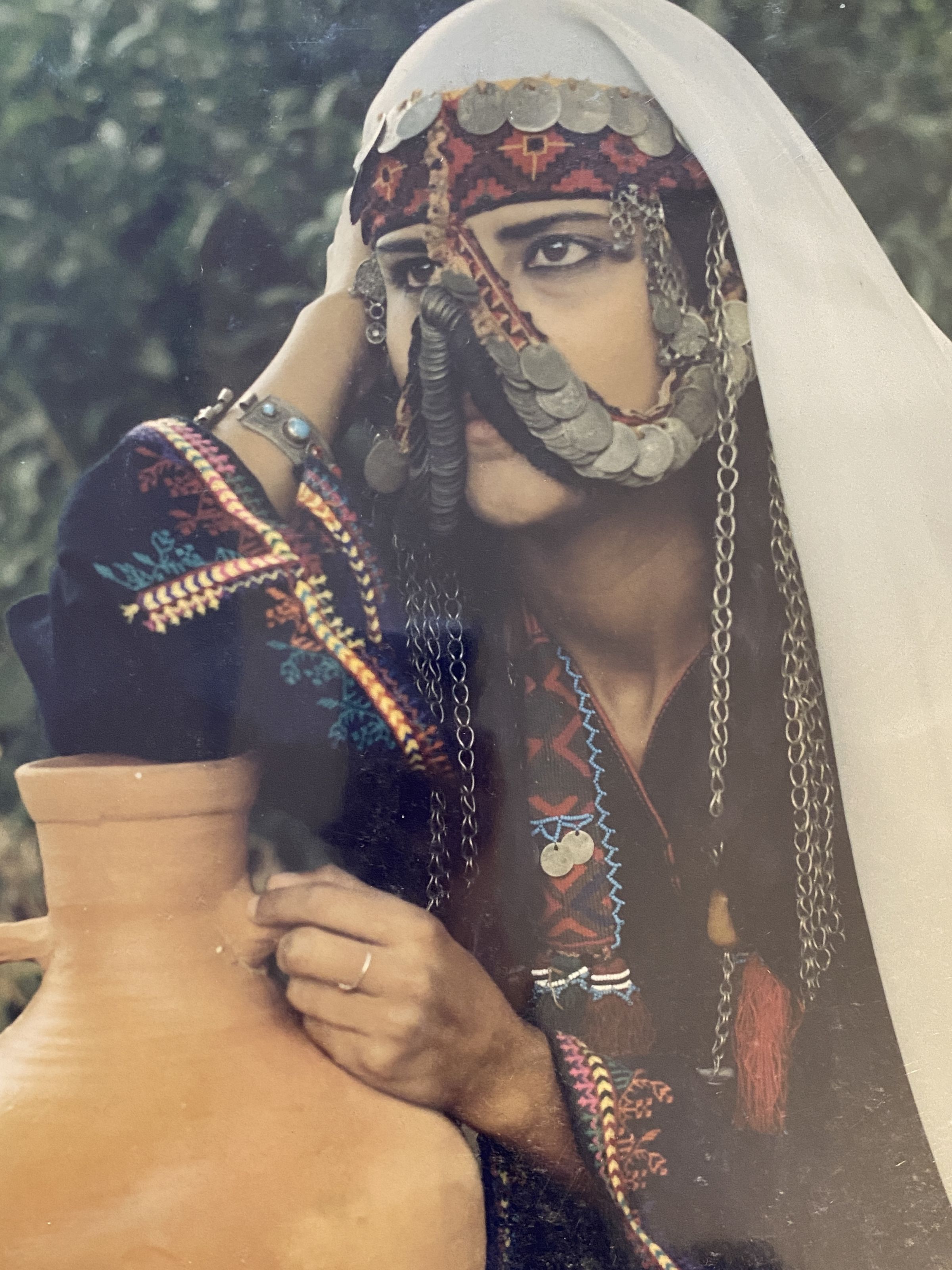 This photograph features a woman dressed in a Bir Saba ensemble, from Southern Palestine, likely taken in the 1980s.Collection