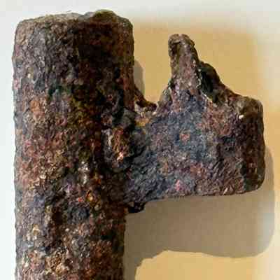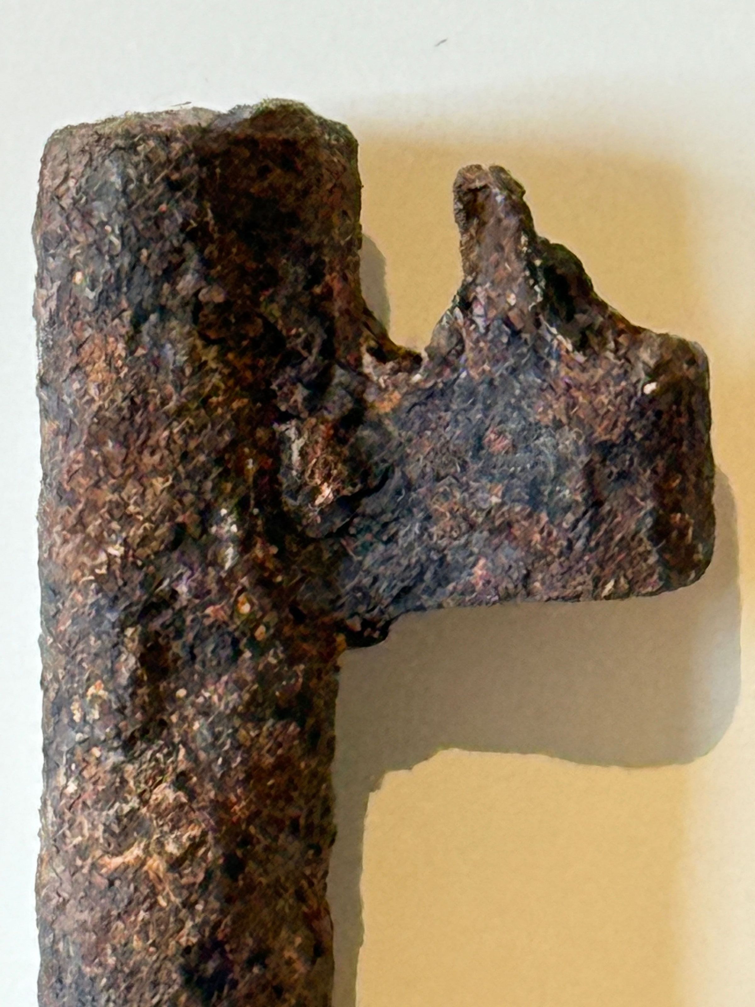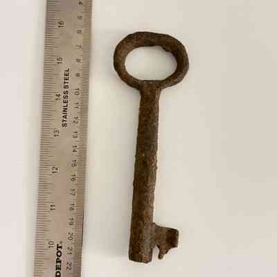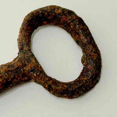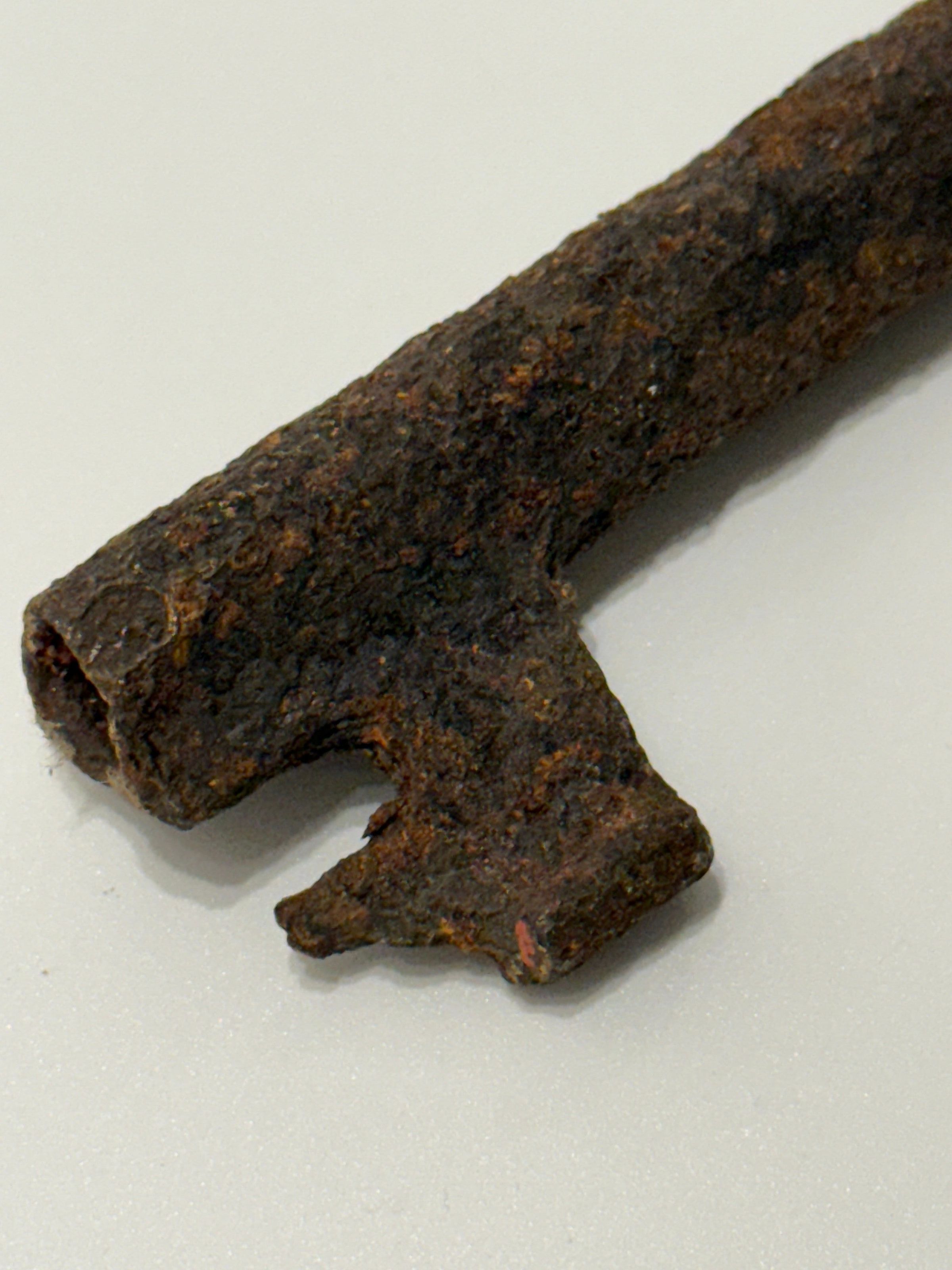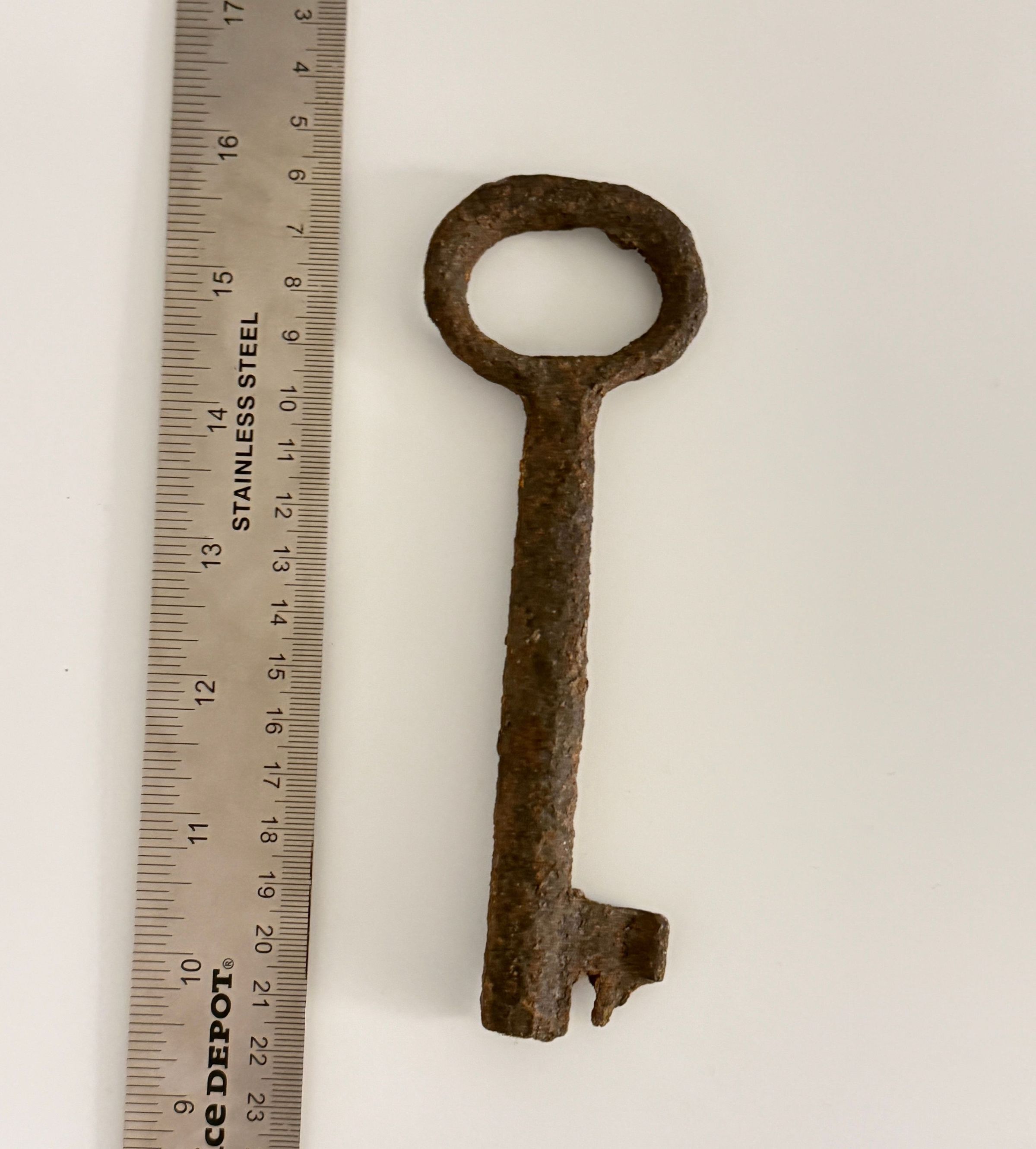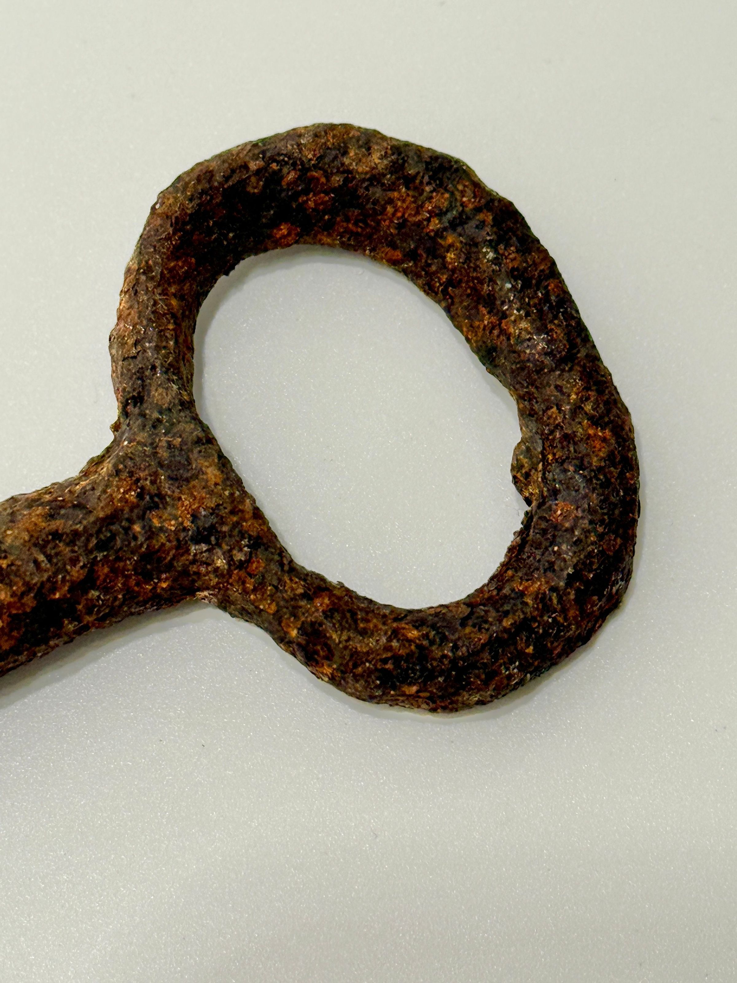 This iron key, now heavily rusted and chipped at the bit, once secured the door of a Palestinian home prior to 1948. This key is heavily rusted and degraded at the handle. It is possible that the key was chipped during the process of degradation. It is difficult to pinpoint the specific year and geography of this key, as iron keys have been used in Palestine and the broader Eastern Mediterranean for centuries, at least since the medieval period. By the 18th and 19th centuries, iron keys were standard for residential doors across rural and urban Palestine.