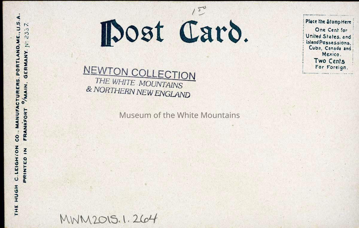 A colored image shows the Frankenstein Trestle with a train running along the tracks that wrap around the mountain. Smoke billows from the smokestack. A building sits to the right of the tracks and trees sit below. In the distance, are mountains and a small body of water. Published by Hugh C. Leighton
