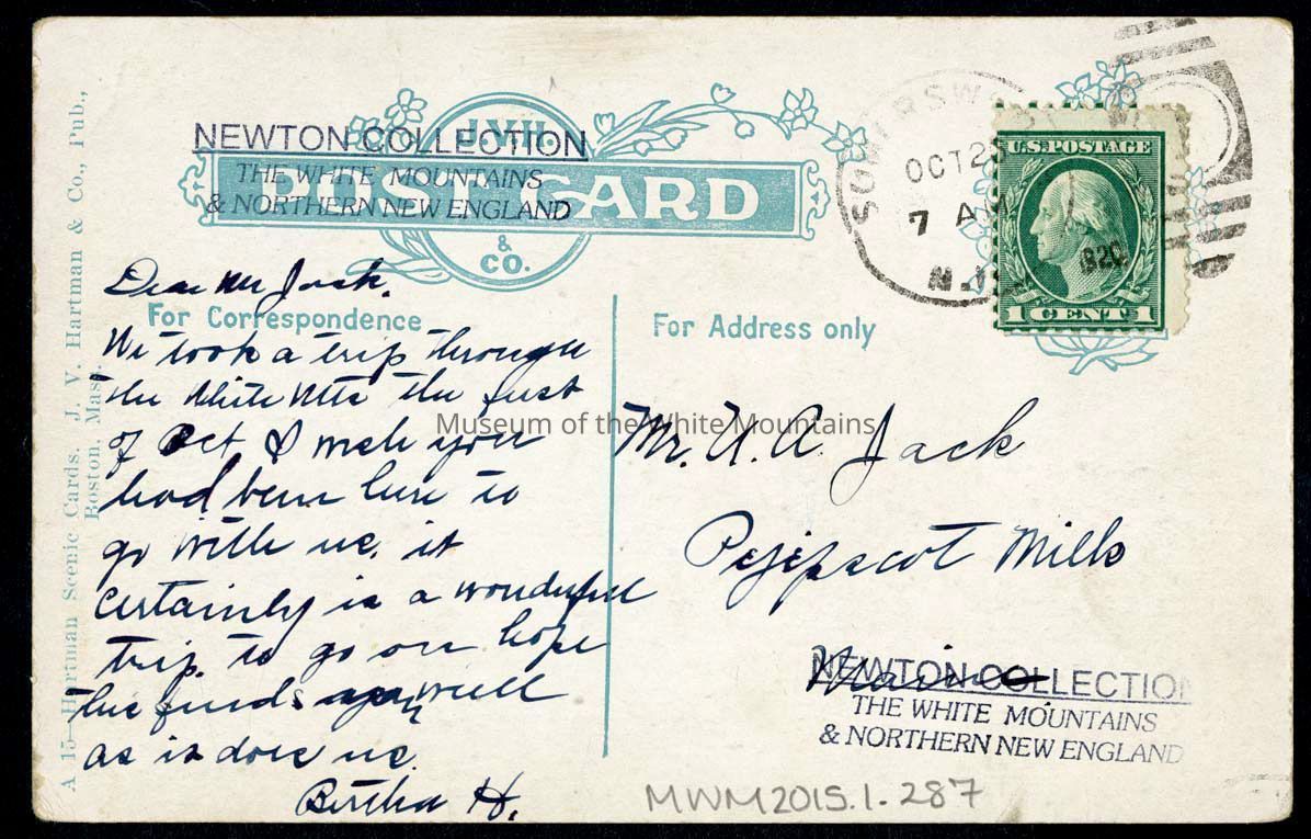 We took a trip through the White Mts the first of Oct I [undistinguishable] you had been sure to go with me, it certainly is a wonderful trip to go on. Hope the [undistinguishable] well as is [indistinguishable]