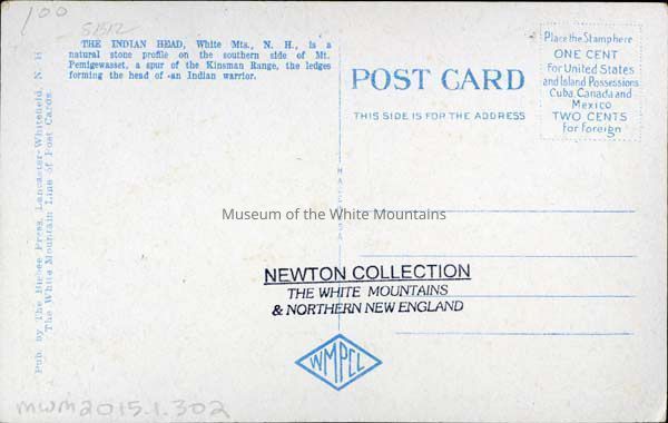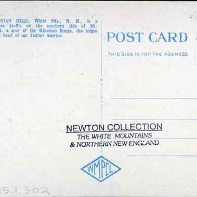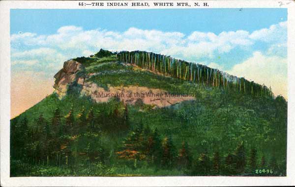 This card depicts a large rock formation which is surrounded by trees and other thick greenery. The Indian Head, White., Mts N. H is a stone formation which is located on the southern side of Mt. Pemigewasset, a spur of the Kingsman Range. Published by Bisbee Press, Lancaster- Whitefield, N. H.Acquisition