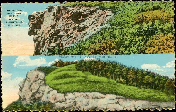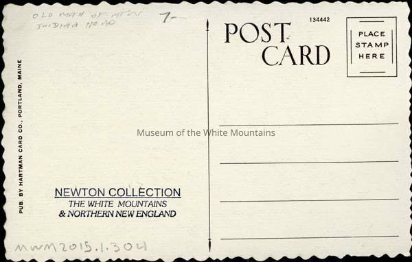 Two depictions of rock formations sit on top of one another. One is The Old Man on Profile Mountain, the other is Indian Head on Pemigewasset Mountain. Both formations are surrounded by trees and other greenery. Published by Hartman Card Co., Portland Maine.Acquisition
