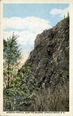 The Webster Profile is seen in this postcard, as a face like formation emerging from the side of a mountain. Trees are visible around the formation as well as in the forest from which the viewpoint seems to be. Published by Dixville Notch Corporation, Dixville Notch, N.H.Acquisition