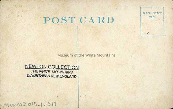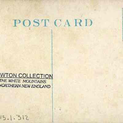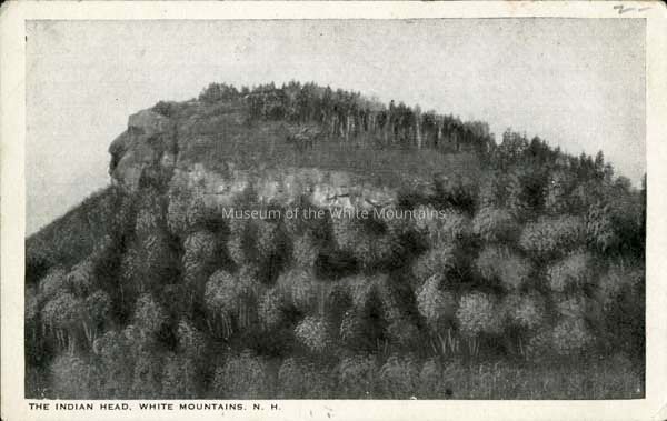 The Indian Head formation is depicted in this postcard. A mountain ledge is emerging from trees and other greenary. The card is in black and white.