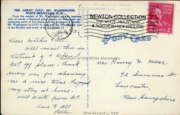Postal Services, Washington, Mount (Coos county, New Hampshire : mountain)Archive Details