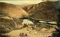 A large lake flows throught a vally in this yellowed postcard. There are many houses, trees, and mountains visible. Published by The Green Mountain Card Co., White River Junction, VtAcquisition