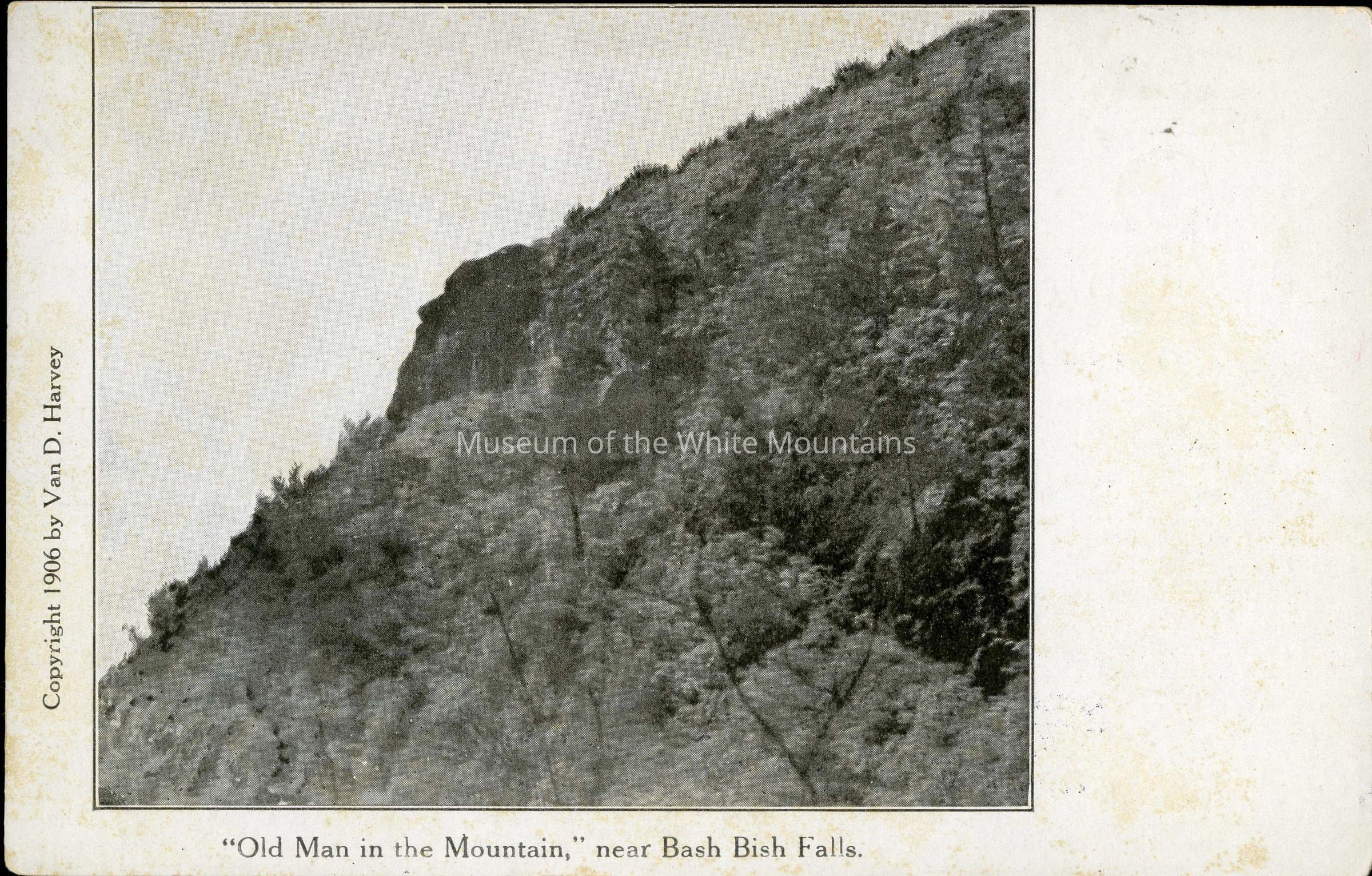 Black and white view of the Old Man of the Mountain. Copyright 1906 by Van D. Harvey.