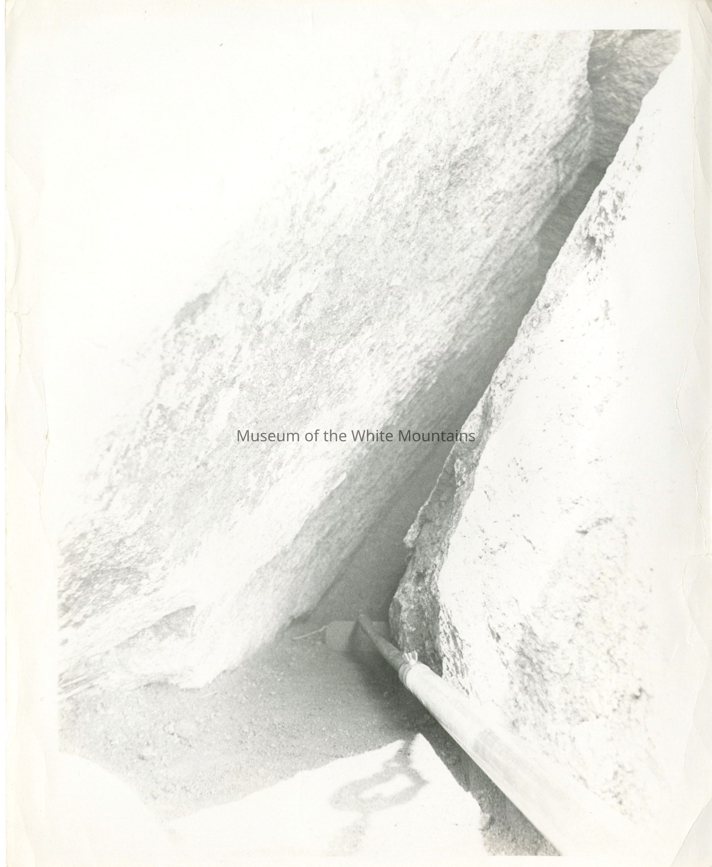 A top-down look into a gap between boulders with a garden hoe (supposedly) being used to show the depth of the crevasse.