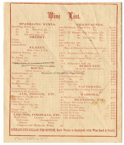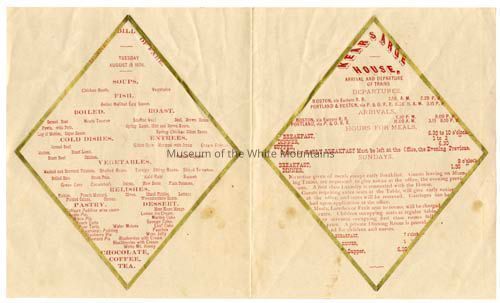 Kearsarge House menu, dated Tuesday, August 15, 1876. Includes meal times, departure and arrival times, and full wine list.Acquisition