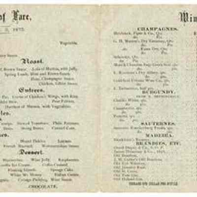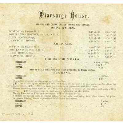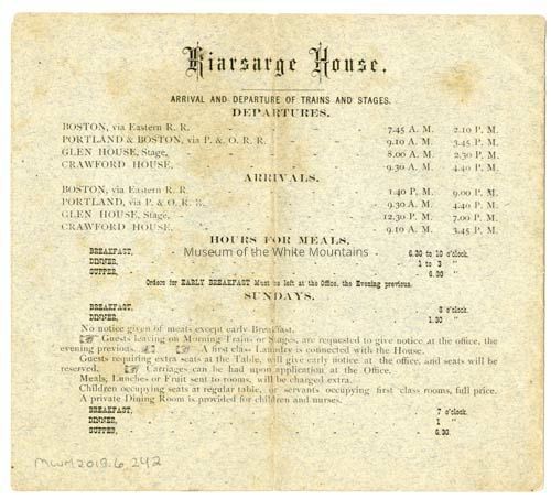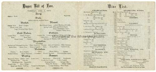 Kearsarge House menu, dated Tuesday, August 3, 1875. Includes meal times, departure and arrival times, and full wine list.Acquisition