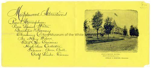 Promotional booklet for the Maplewood Hotel. Includes a photo of the hotel and lists the hotel's attraction. Undated, circa 1895.Acquisition