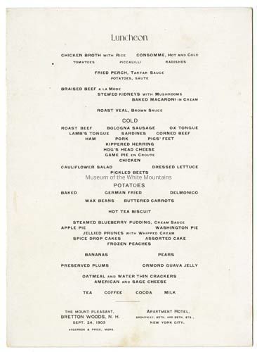 Mount Pleasant House Luncheon Menu, 1903Entry/Object ID
