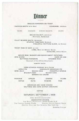 Dinner menu for the Mount Pleasant house, dated Saturday September 1, 1906. On the verso is a photo of the Great Stoone Face (Old Man of the Mountain).