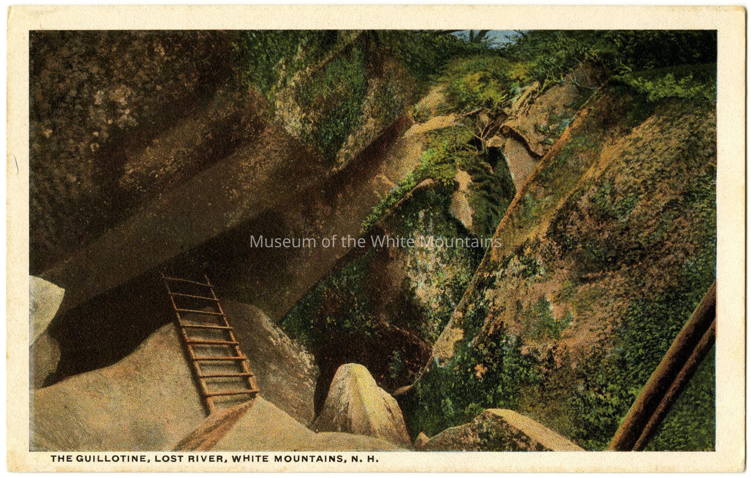 A postcard containing a landscape image of 'The Guillotine,' Lost River, White Mountains, NH. The image is in color.