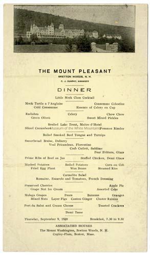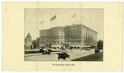 Dinner menu for the Mount Pleasant house, dated Thursday September 9, 1920. On the verso is a depiction of the Copley-Plaza Hotel in Boston.