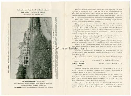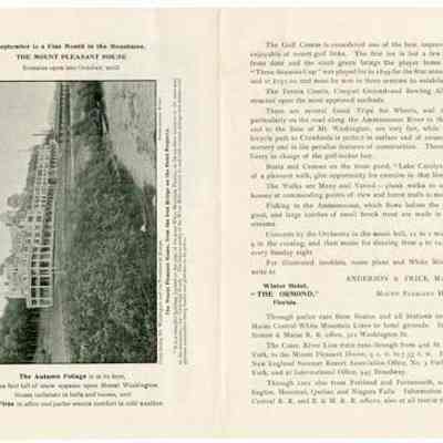 Promotional pamphlet for the Mount Pleasant House. Lists hotel amenities, such as entertainment, recreation, and dining fare, plus local attractions. Undated.Acquisition