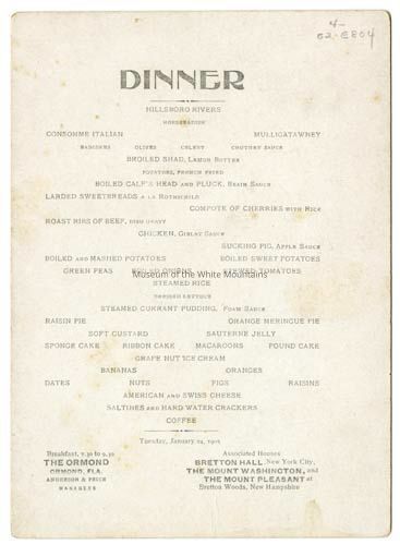 Hotel menu for an unidentifed hotel (possibly Hillsboro Rivers), an associated hotel of the Mount Washington Hotel and the Mount Pleasant Hotel in Bretton Woods. Dated Tuesday, January 24, 1905. On the verso is a photograph of the front exterior of the Mount Washington; "From Bretton Woods to Crawfords by Coach - the start from the Mount Washington."Acquisition