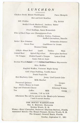 Mount Washington Hotel Luncheon Menu, 1911Entry/Object ID