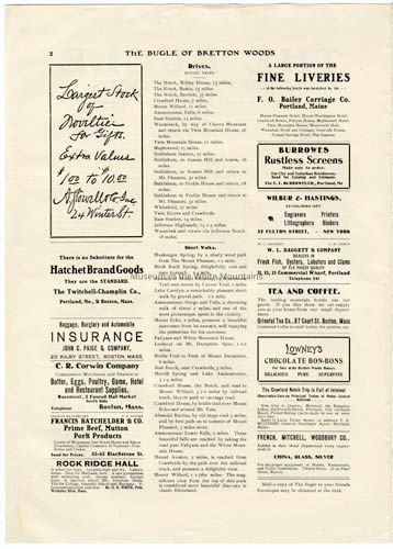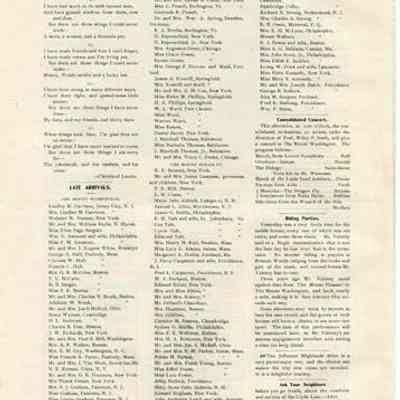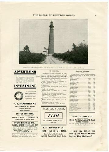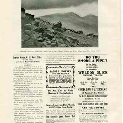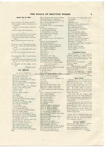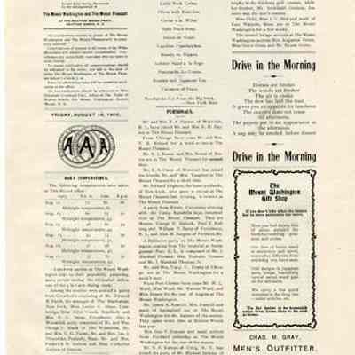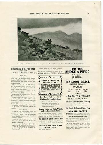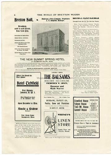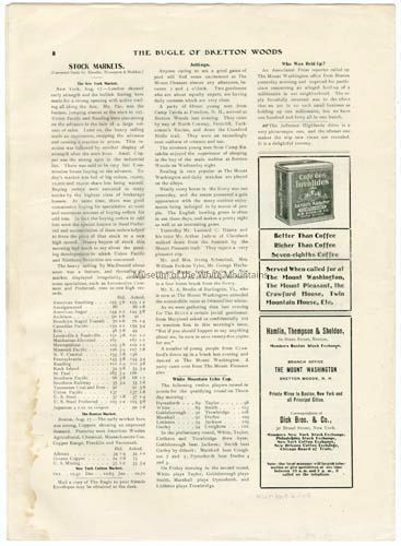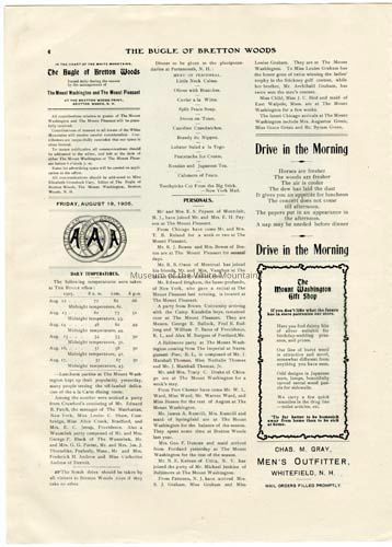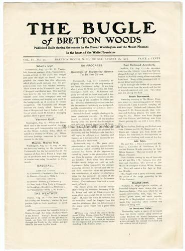 The Bugle of Bretton Woods, Vol. IV - No. 30. Published Fridau August 18, 1905. Newsletter published daily during the season by the Mount Washington and Mount Pleasant. Features global news, sports, society gossip, office news, local drives and walks, arrivals, and railroad information. Includes list of the Bretton Woods Orchestra members. Throughout are advertisements from other hotels including The Balsams, Crawford House, Fabyan House, Twin Mt. House, Summit House, as well as Boston hotels, and businesses.Acquisition