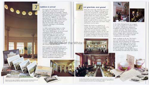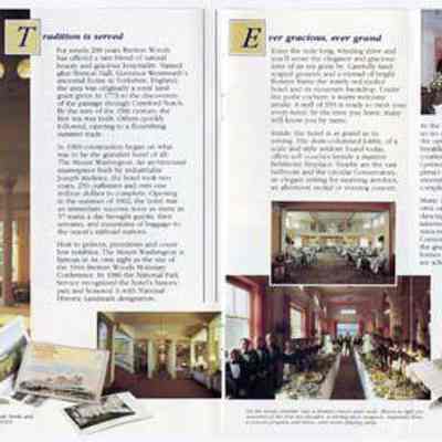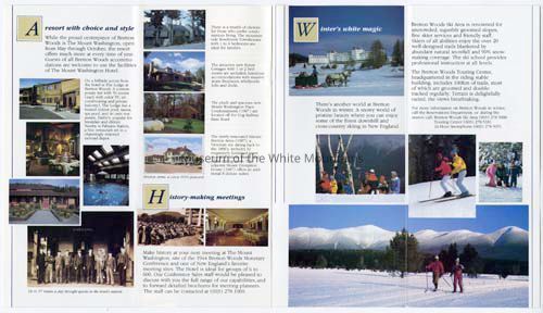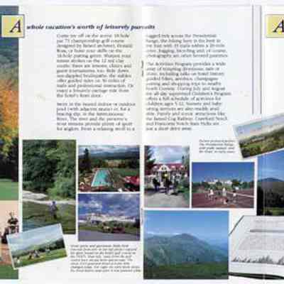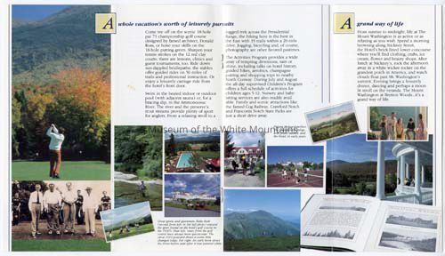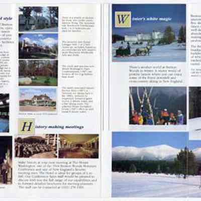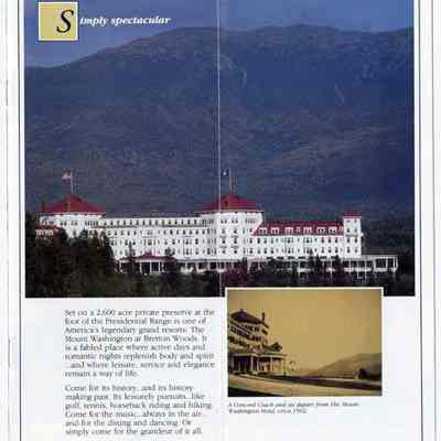 Folded promotional pamphlet advertising the Mount Washington Hotel, circa 1999. Features the hotel amenities including horeseback riding, golfing, summer and winter outdoor recreation pursuits, food, and luxury ambiance.Acquisition