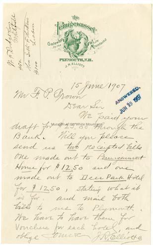 Letter from J.R. Elliot of the Pemigewasset House to F.P. Brown dated June 15, 1907. In the letter, Elliot asks Brown to send two reciepts for a $25 bill that he has paid, one made to the Pemigewasset House and one to the Deer Park Hotel.Acquisition