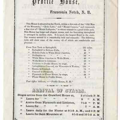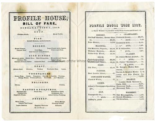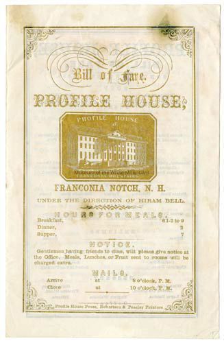 Profile House bill of fare, dated Sunday August 7, 1859. The cover features an illustration of the hotel and a decorative frame; the cover is printed in gold colored ink. In addition to the menu, the bill of fare lists available beverages, including wine, champagne, sherry, cider, porter, ale, and liquor. The verso includes the distances to Profile House from other New England towns and timetable for the arrival of stages.Acquisition
