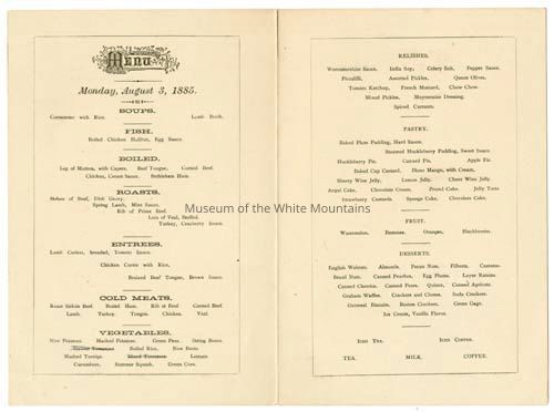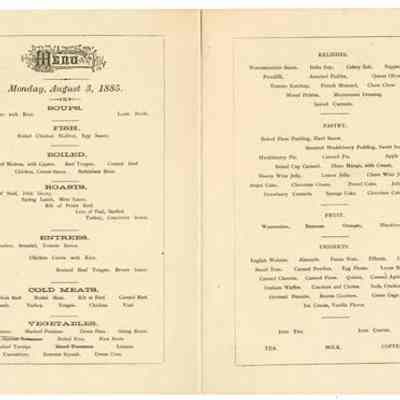 Sinclair House menu, dated Monday August 3, 1885. Features a drawing of a chef standing over a spit on the front cover and stylized design.