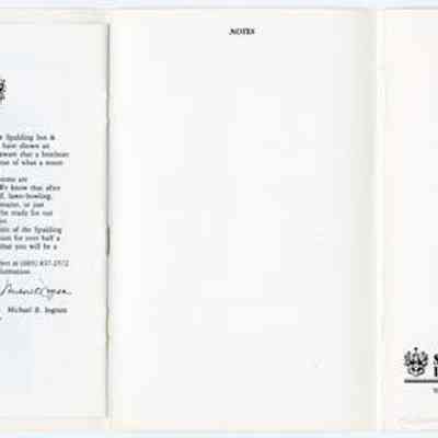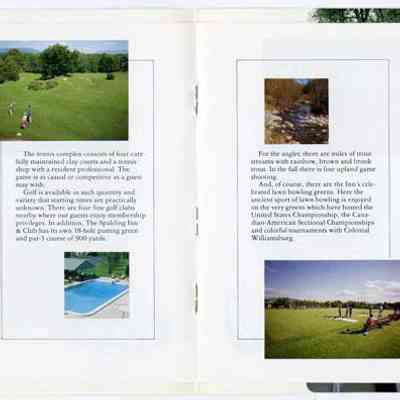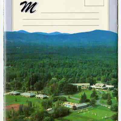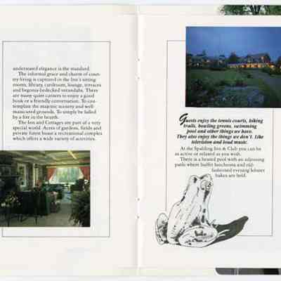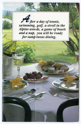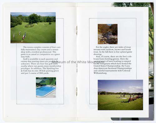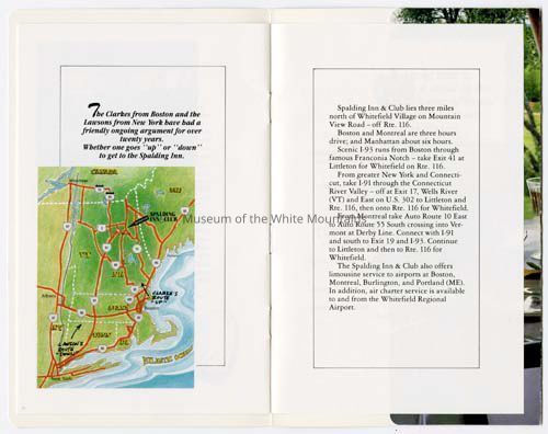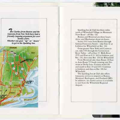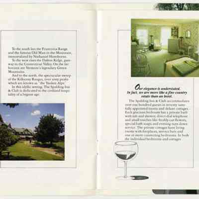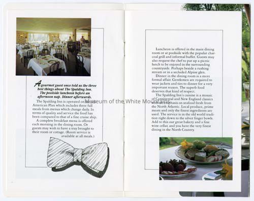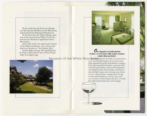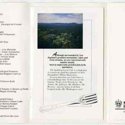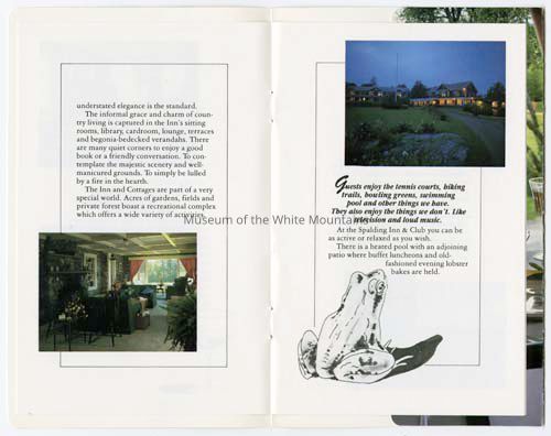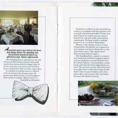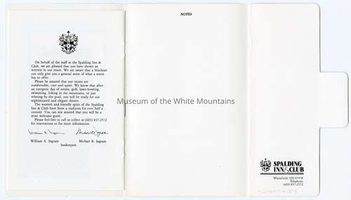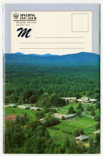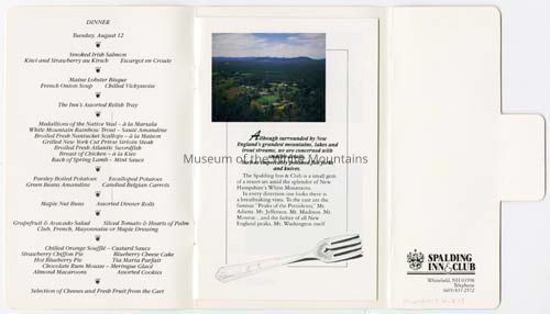Mailing brochure/ envelope advertising the Spalding Inn and Club in Whitefield, NH. Features dinner menu for August 12, information and photographs about the guest rooms, common spaces, dining, as well as recreational activities like tennis, heated pool, golf, and fishing. Undated, circa 1995.Acquisition