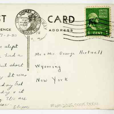 Transcription: 7-3-50, Here's where we slept last night. We had a fairly rugged but short climb yesterday. It was nice + clear yesterday but today it is cloudy + it has been raining. We are hoping it will clear. Elinor