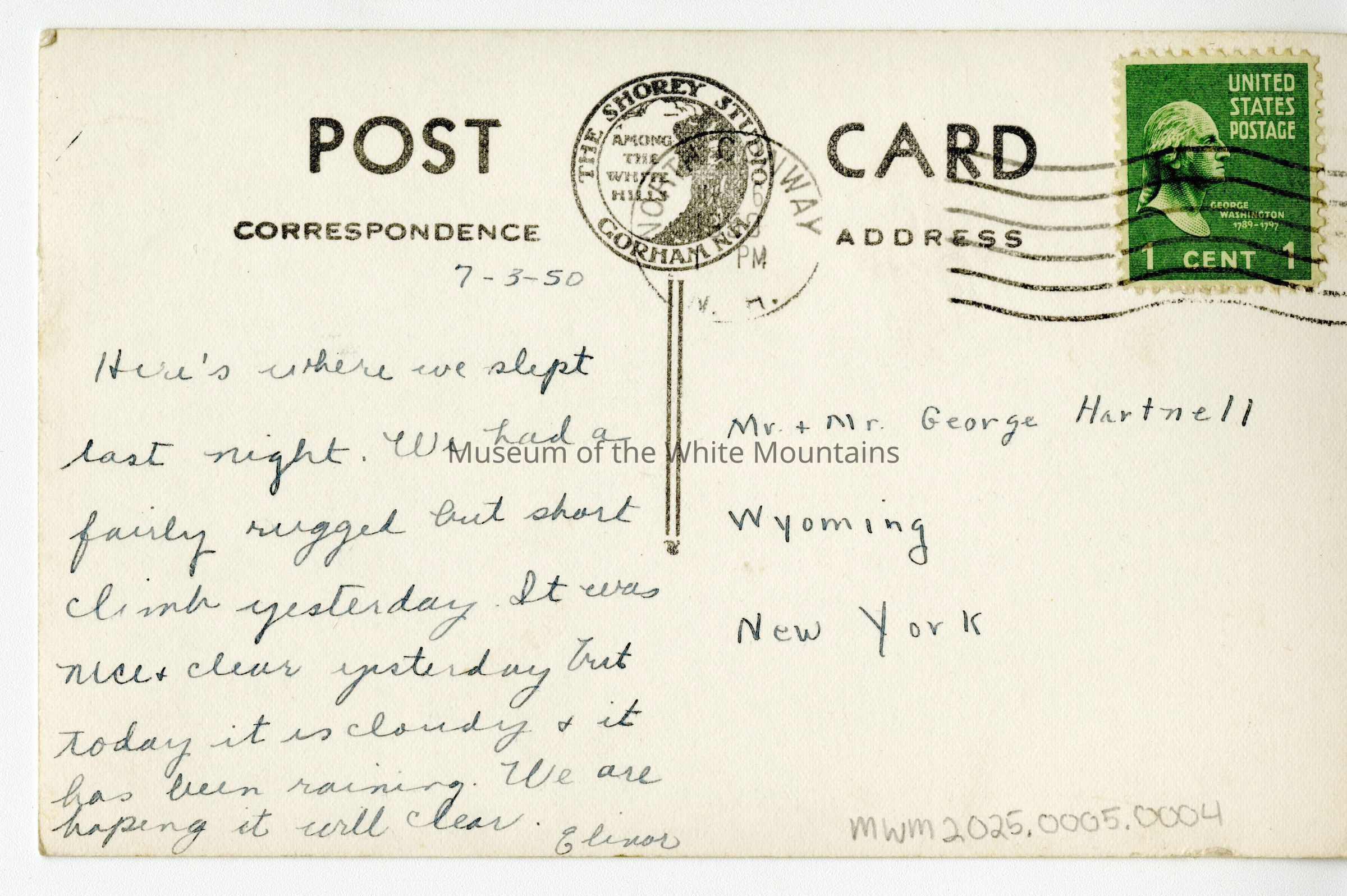 A postcard containing a photograph of Greenleaf Hut and the northern peak of Mt. Lafayette. The image is in black and white. Typical post card back stamped with Shorey Studio, Gorham, NH. Postmarked from North Conway, NH on the 6th of an obscured month, 1950, at 1pm.