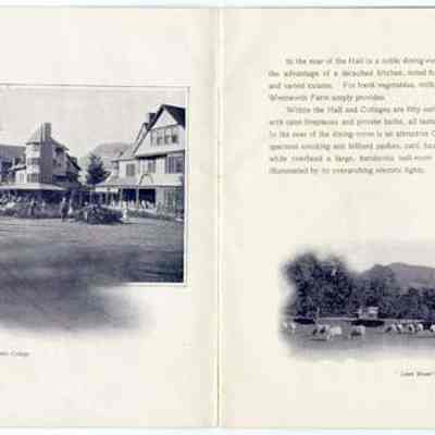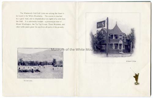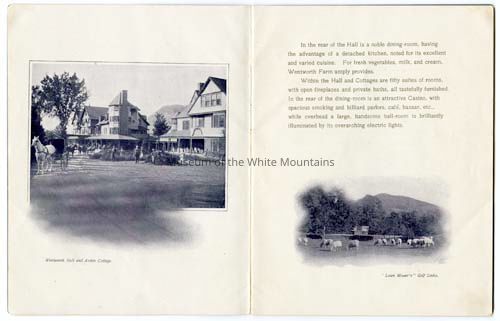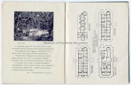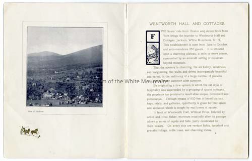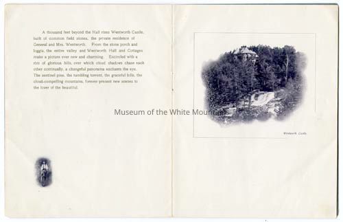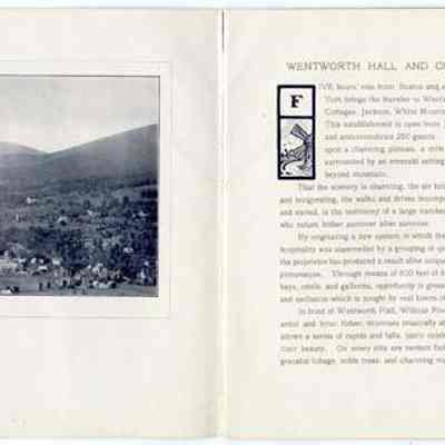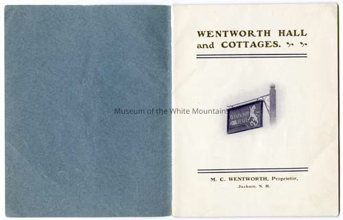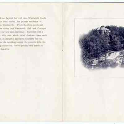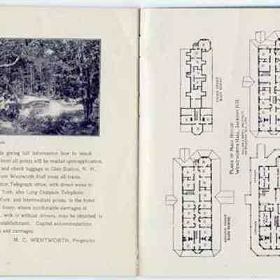Promotional booklet for Wentworth Hall and Cottages, circa 1900. Ilustrated with black and white photographs and drawings of the hotel. Lists the amenities, which include the convenient location, excellent dining and food, accomodations and local attractions. Also include floorplans, which allowed guests to see the layout of the hotel and choose their rooms.Acquisition