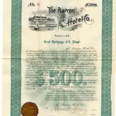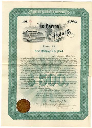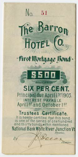 Barron Hotel Co. First Mortgage 6% Bond, No. 51, dated October 1, 1896. Signed by Oscar G. Barron, president, and C.H. Merrill, treasurer. Stamped with Barron Hotel Company seal.Acquisition