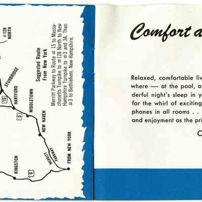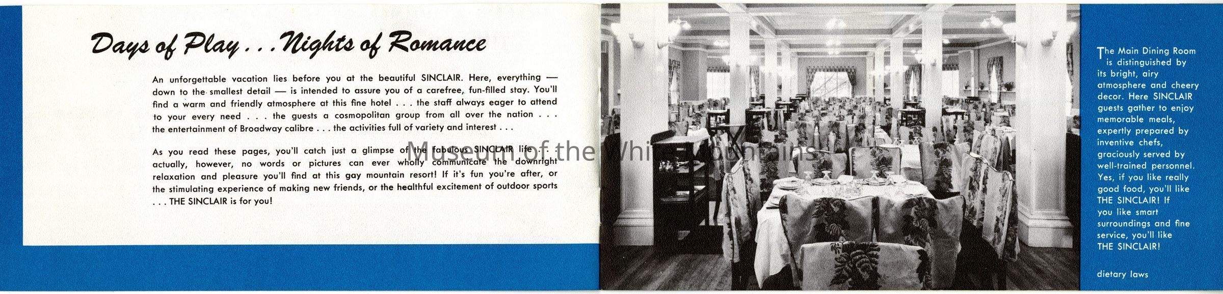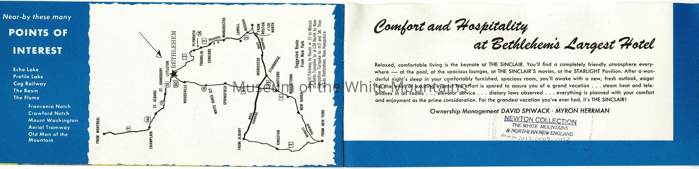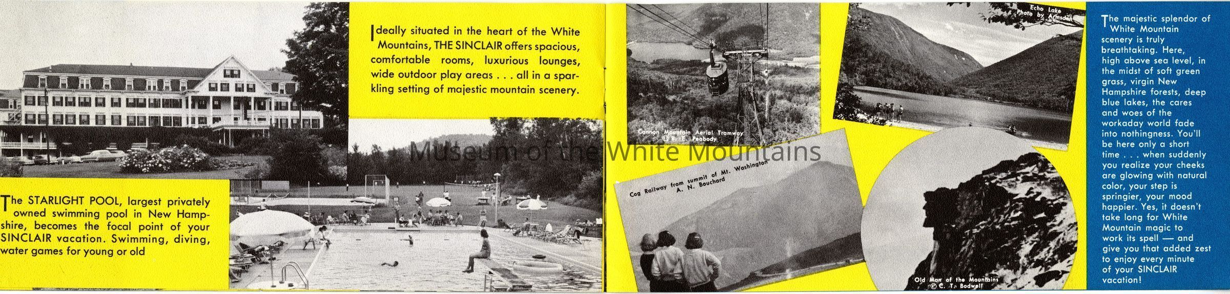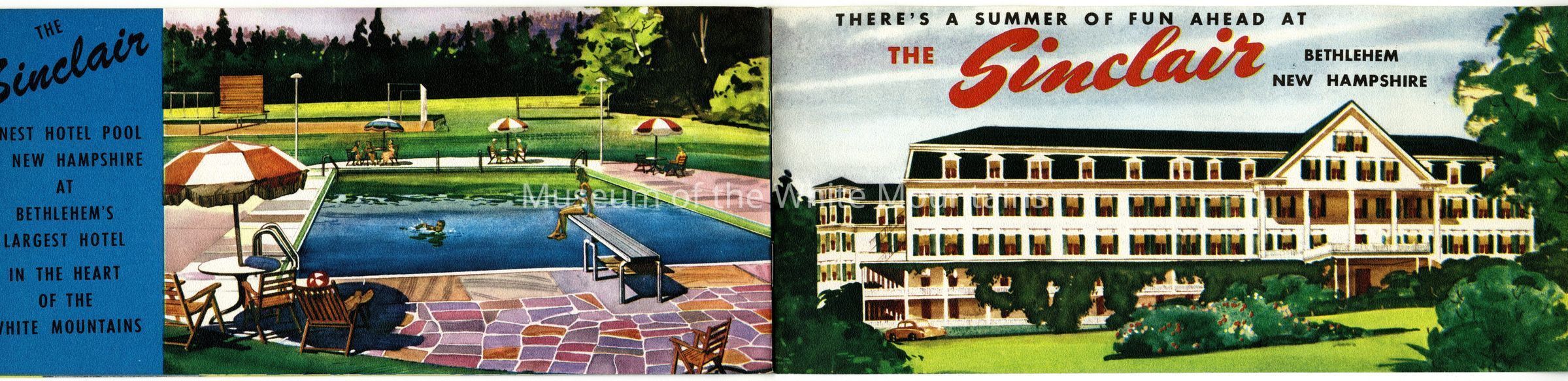 A colorful information pamphlet on the Sinclair hotel in Bethlehem New Hampshire. (scanned duplicate of MWM2017.0005.0114 and MWM2017.0005.0115)