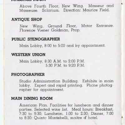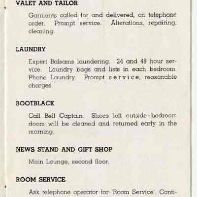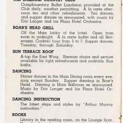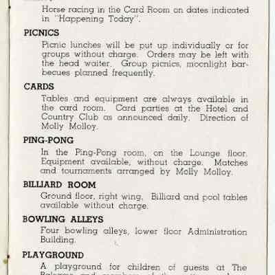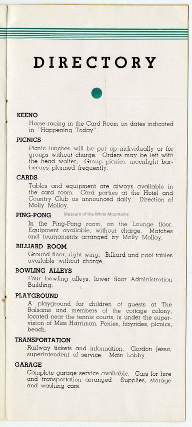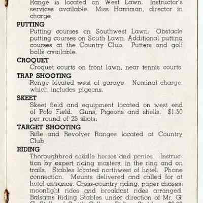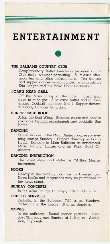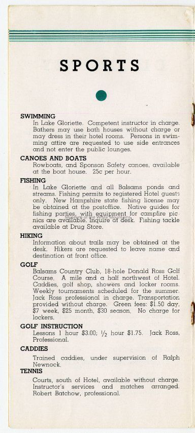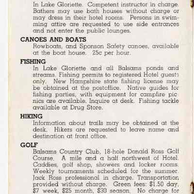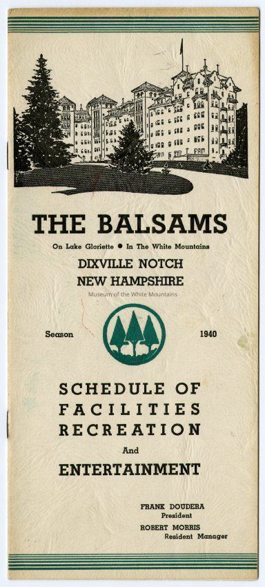 Brochure describing the schedule for sports, recreation and entertainment at the Balsams Hotel for the 1940 season.