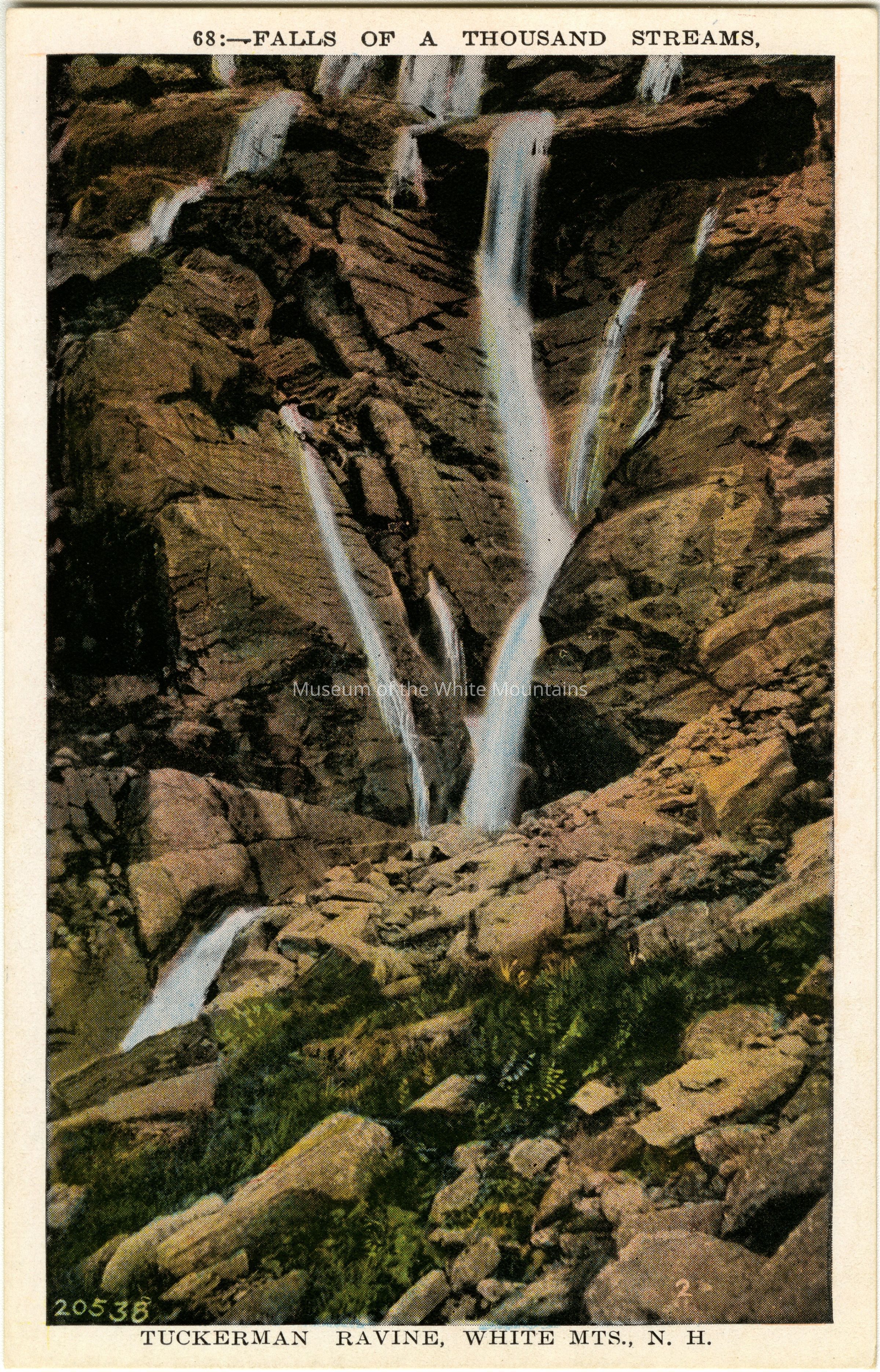 A postcard containing a portrait image of the 'Falls of a Thousand Faces,' in Tuckerman Ravine.
