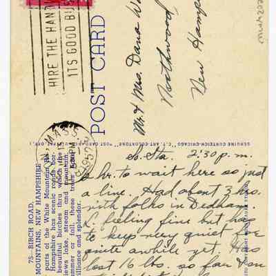 Transcription: "2 hr. to wait here so just a line. Had about 3 hrs. with folks in Dedham. L. feeling fine just has to keep very quiet for quite awhile yet. Has lost 16 lbs so far + on strict diet to lose much more. Getting quite hot here. Phoned Rodney this a.m. Going to Tiners so may not meet me. Love Ruth."Acquisition