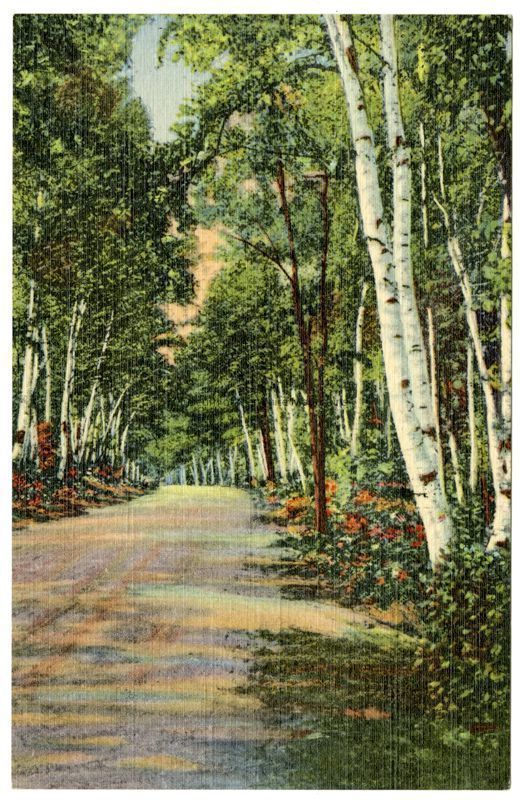 Colorized postcard depicting an unidentified dirt road flanked on both sides by birch trees.