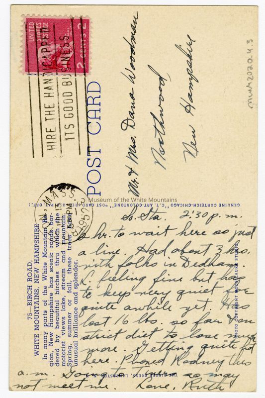 Back Description: Typical postcard back. Addressed to Mr. and Mrs. Dana Woodman, Northwood NH. Dated July 20, 1954. Stamped on the back is "Hire the handicapped. It's good business."
