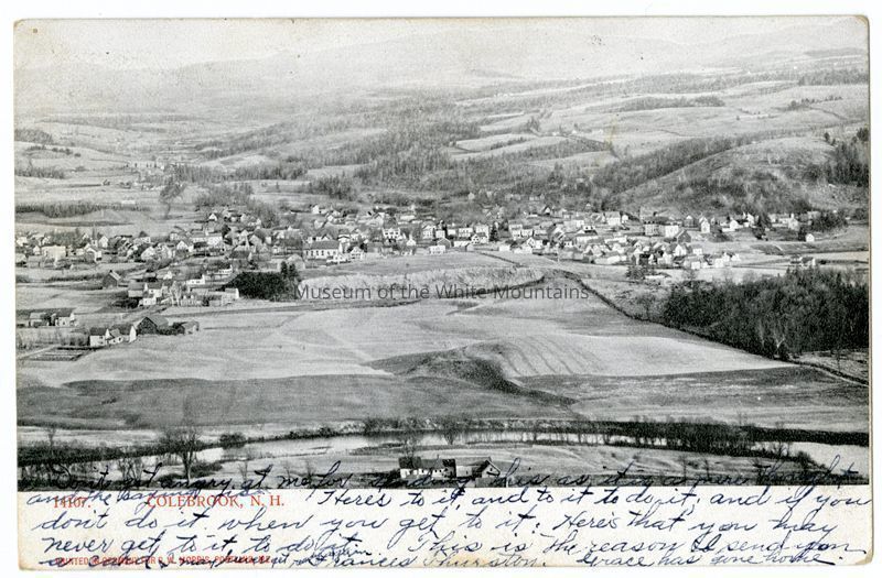 Postcard with black and white image depicting the village of Colebrook, N.H. and the surrounding fields and mountains.