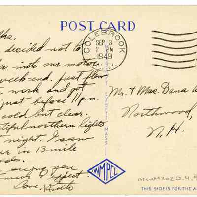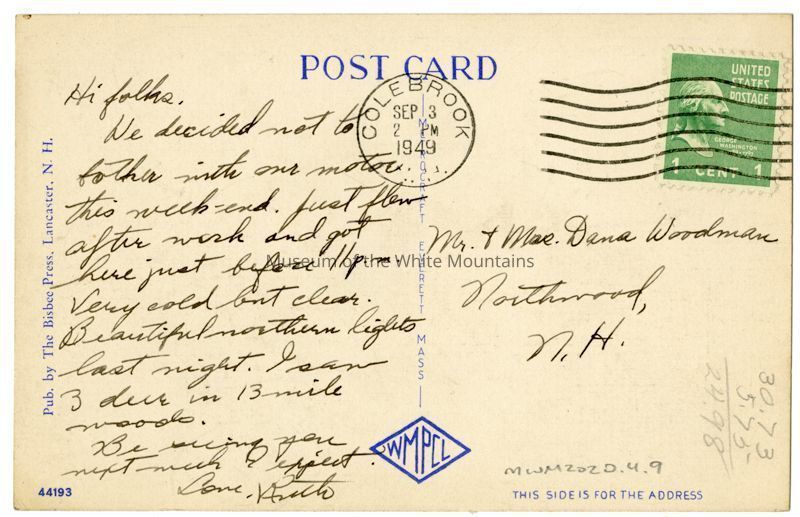 Back Description: Typical postcard back. Addressed to Mr. + Mrs. Dana Woodman, Northwood N.H. Dated Sept 3, 1949.