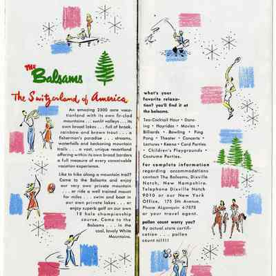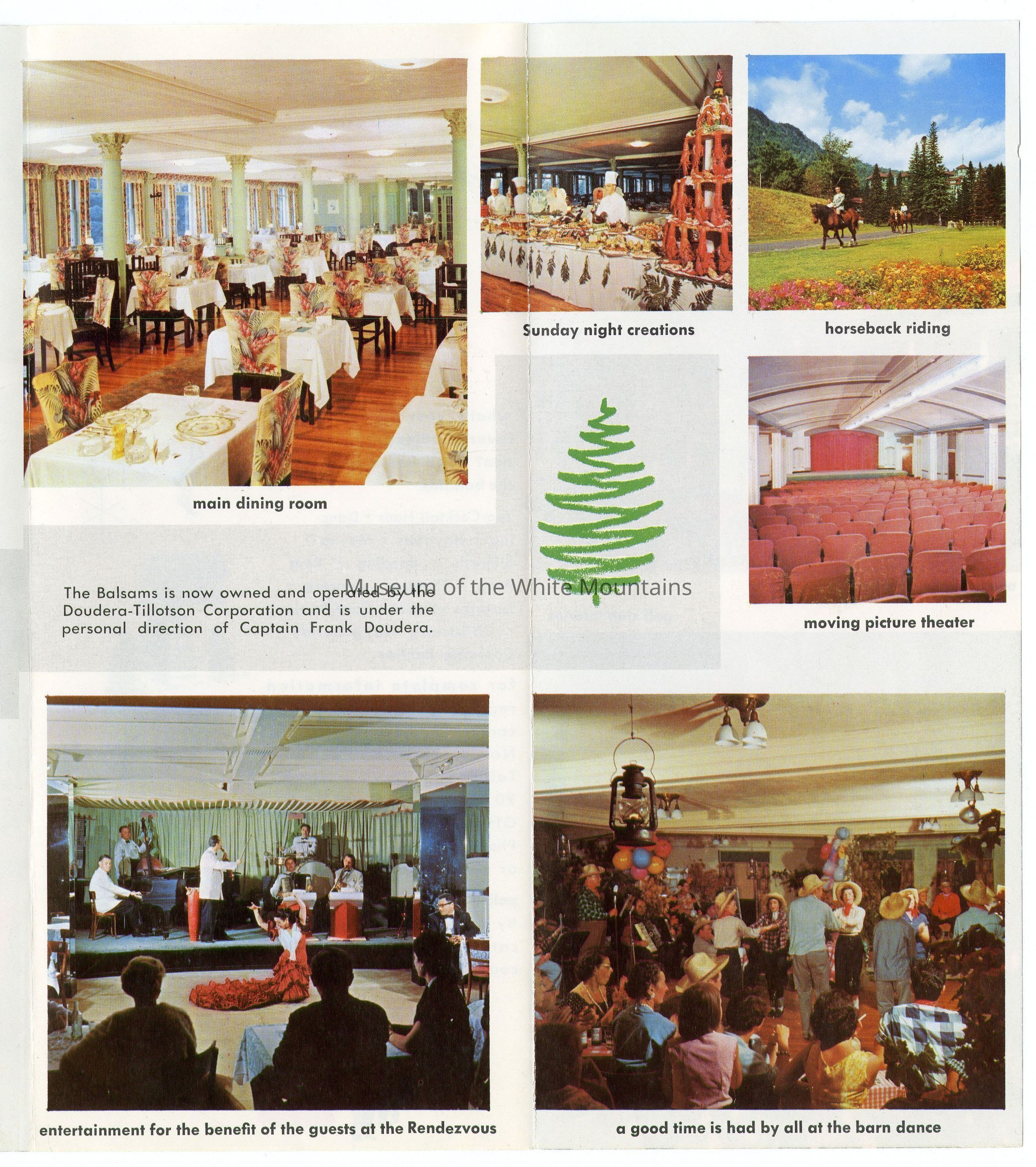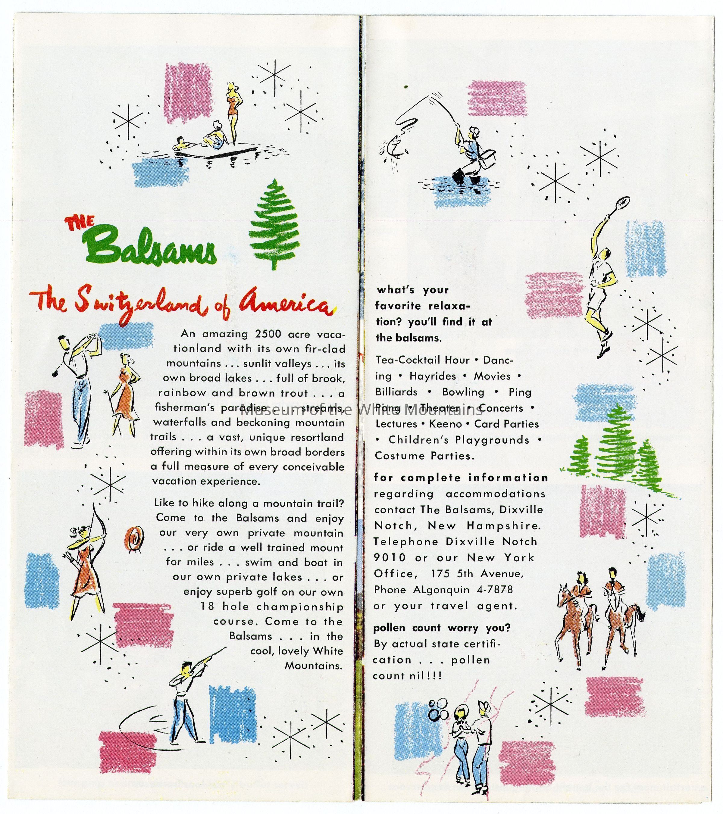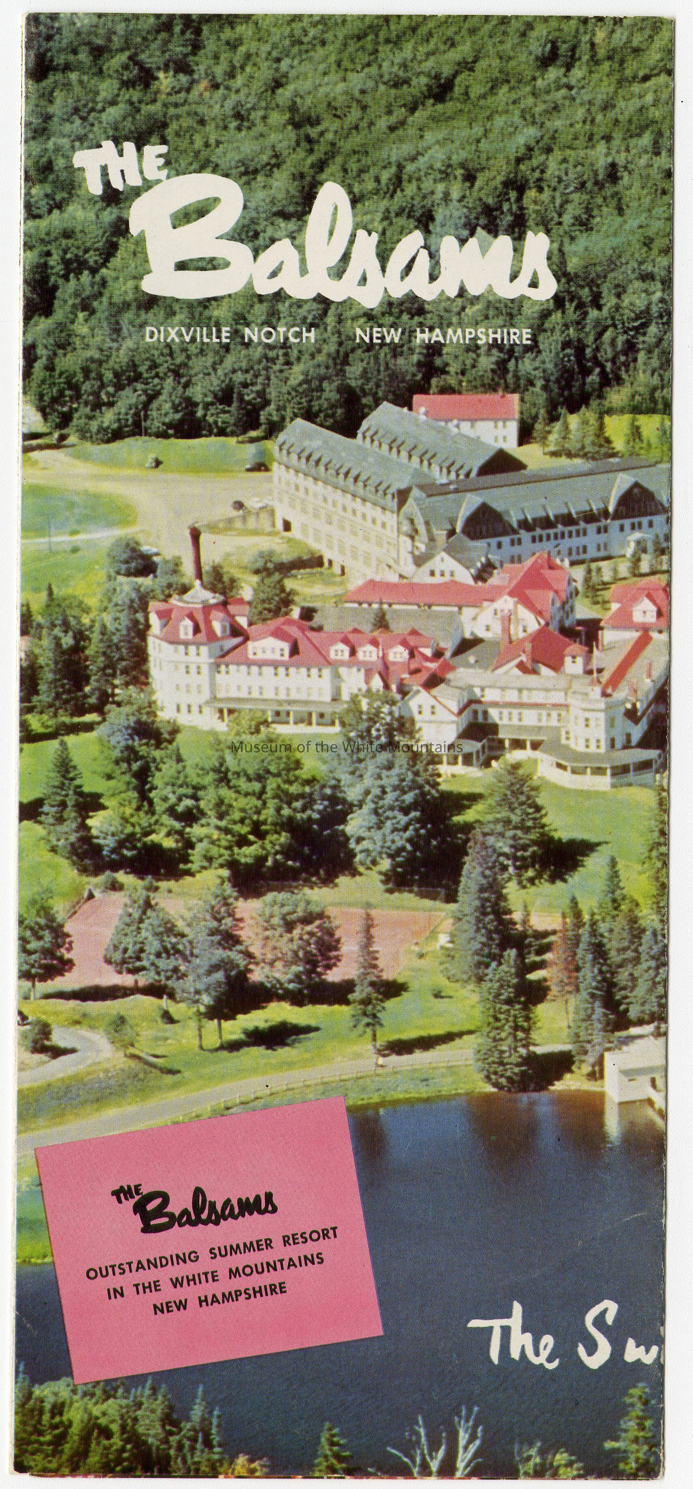 Brochure describing the Balsams Hotel, its ammenities, and activities for sports and leisure. Enclosed are images of of housekeeping cottages, a typical bedroom, golf club interior, main dining room, and the moving picture theater along with a description of the 18 hole golf course.Acquisition