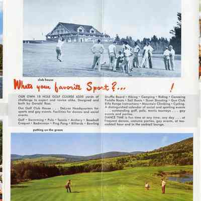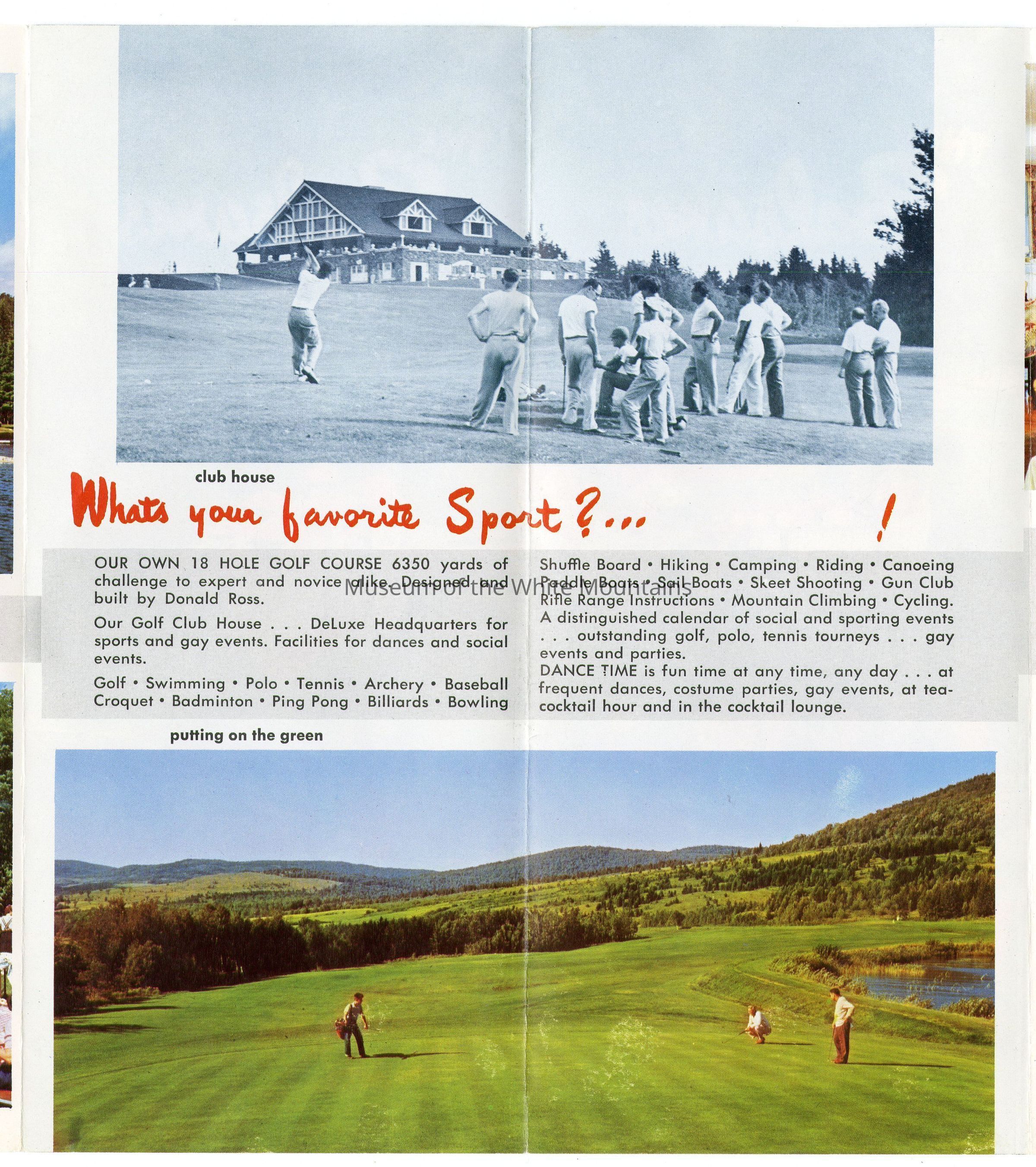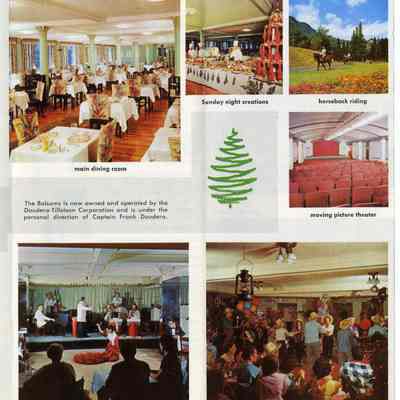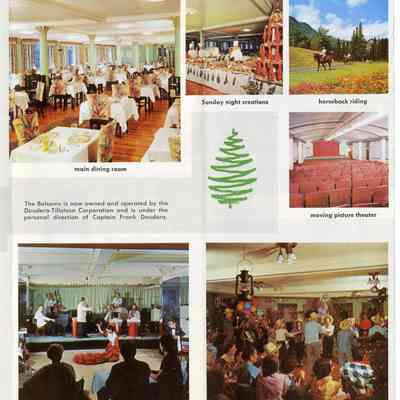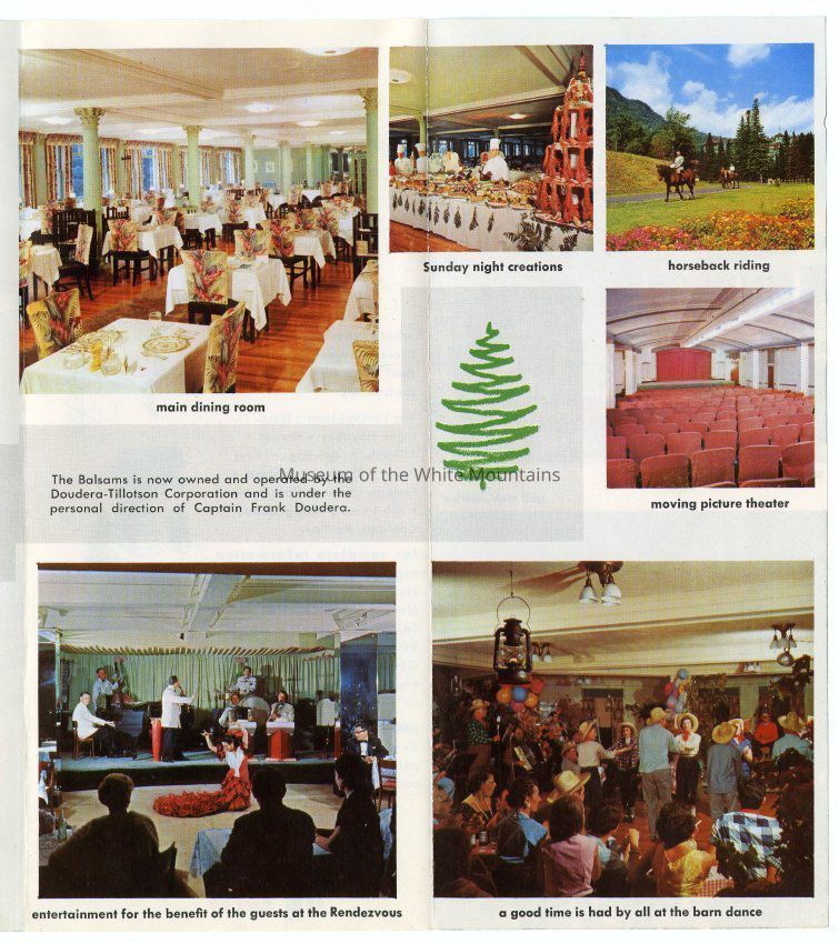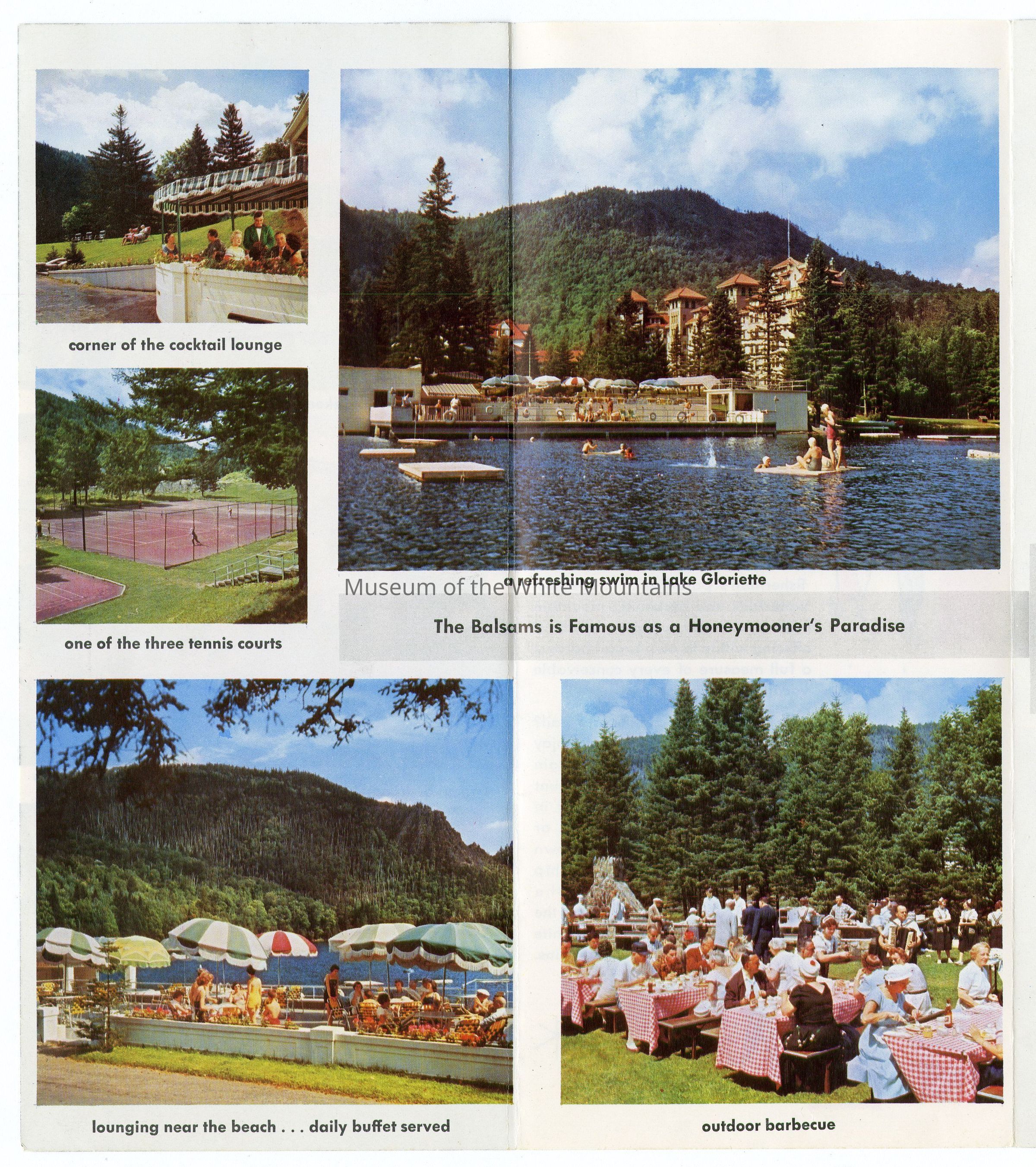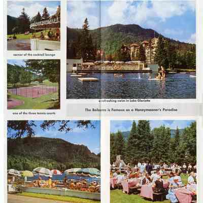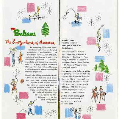Brochure describing the Balsams Hotel, its ammenities, and activities for sports and leisure. Enclosed are images of of housekeeping cottages, a typical bedroom, golf club interior, main dining room, and the moving picture theater along with a description of the 18 hole golf course.Acquisition