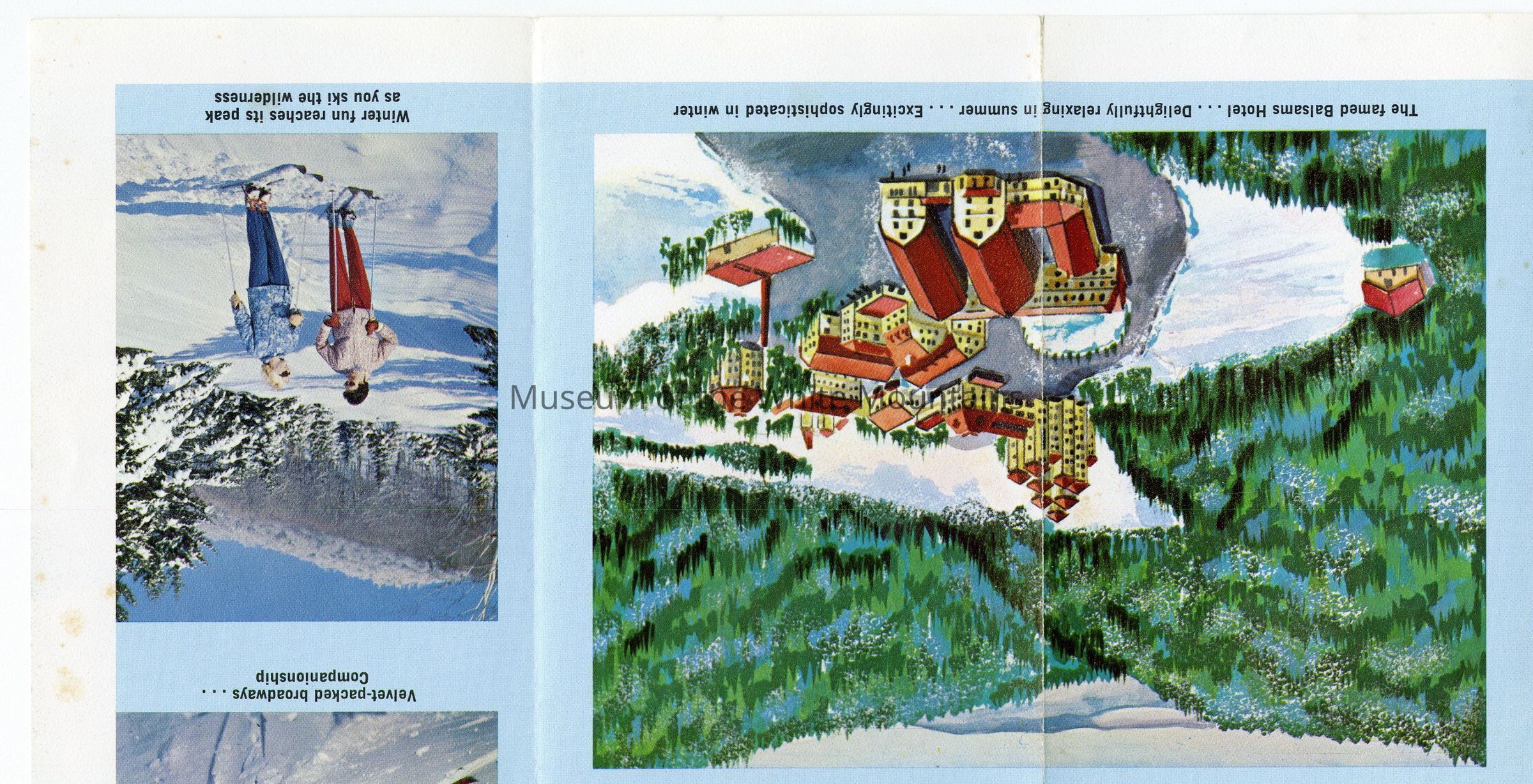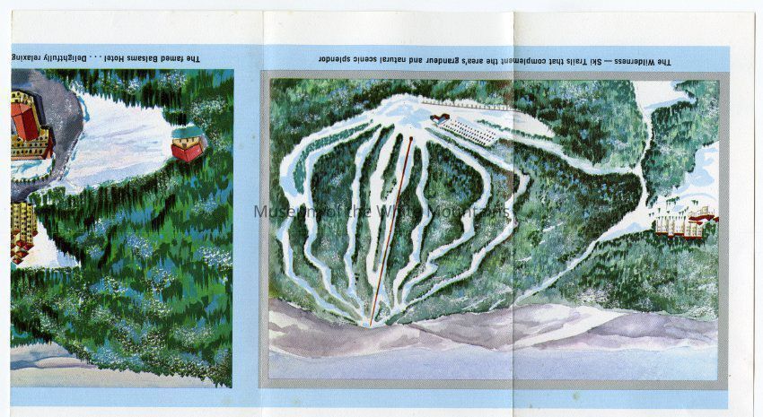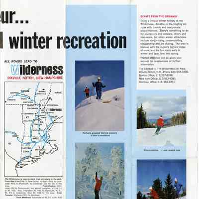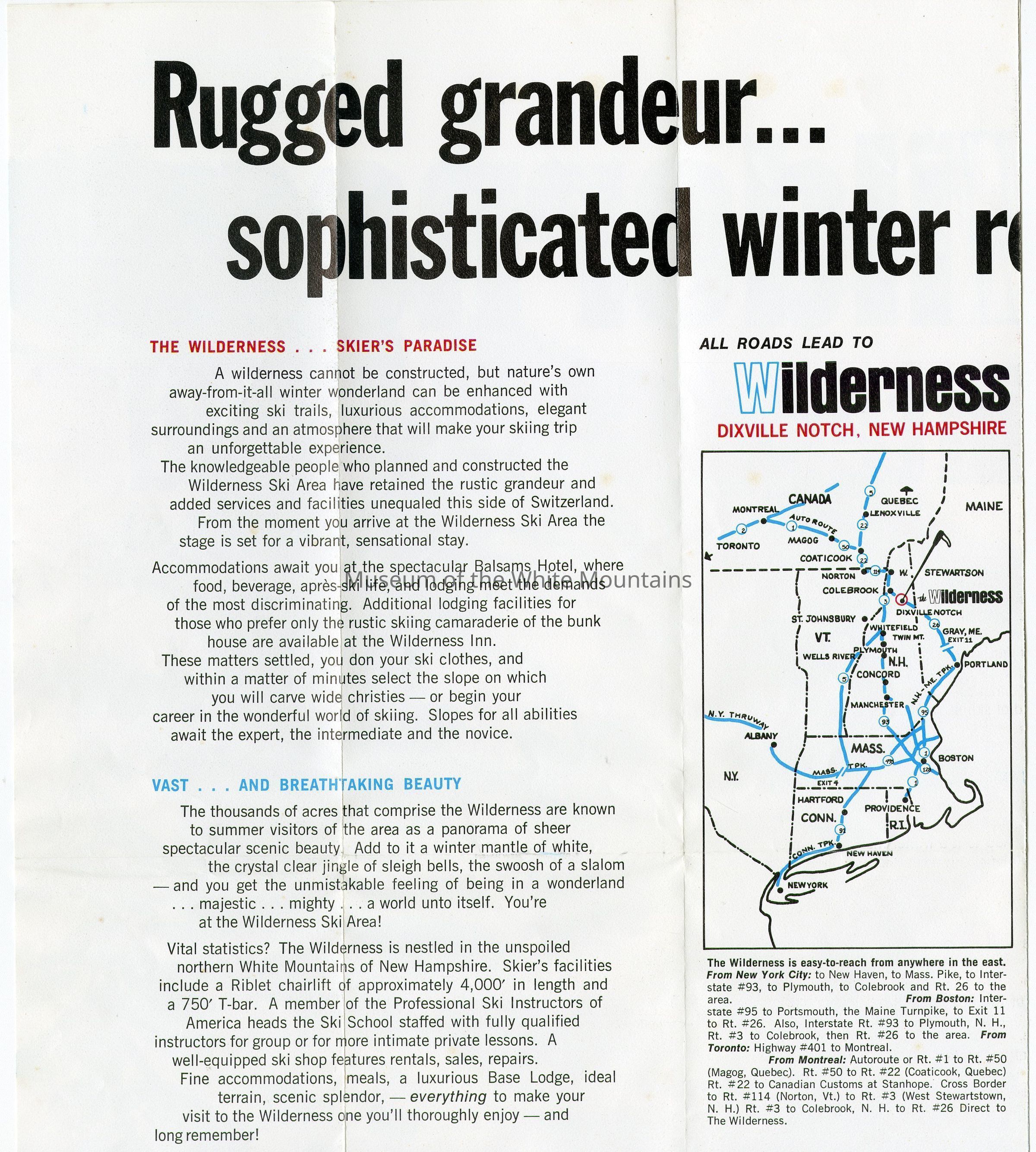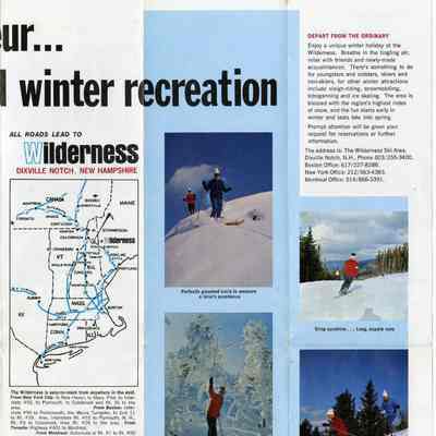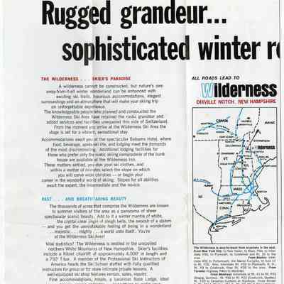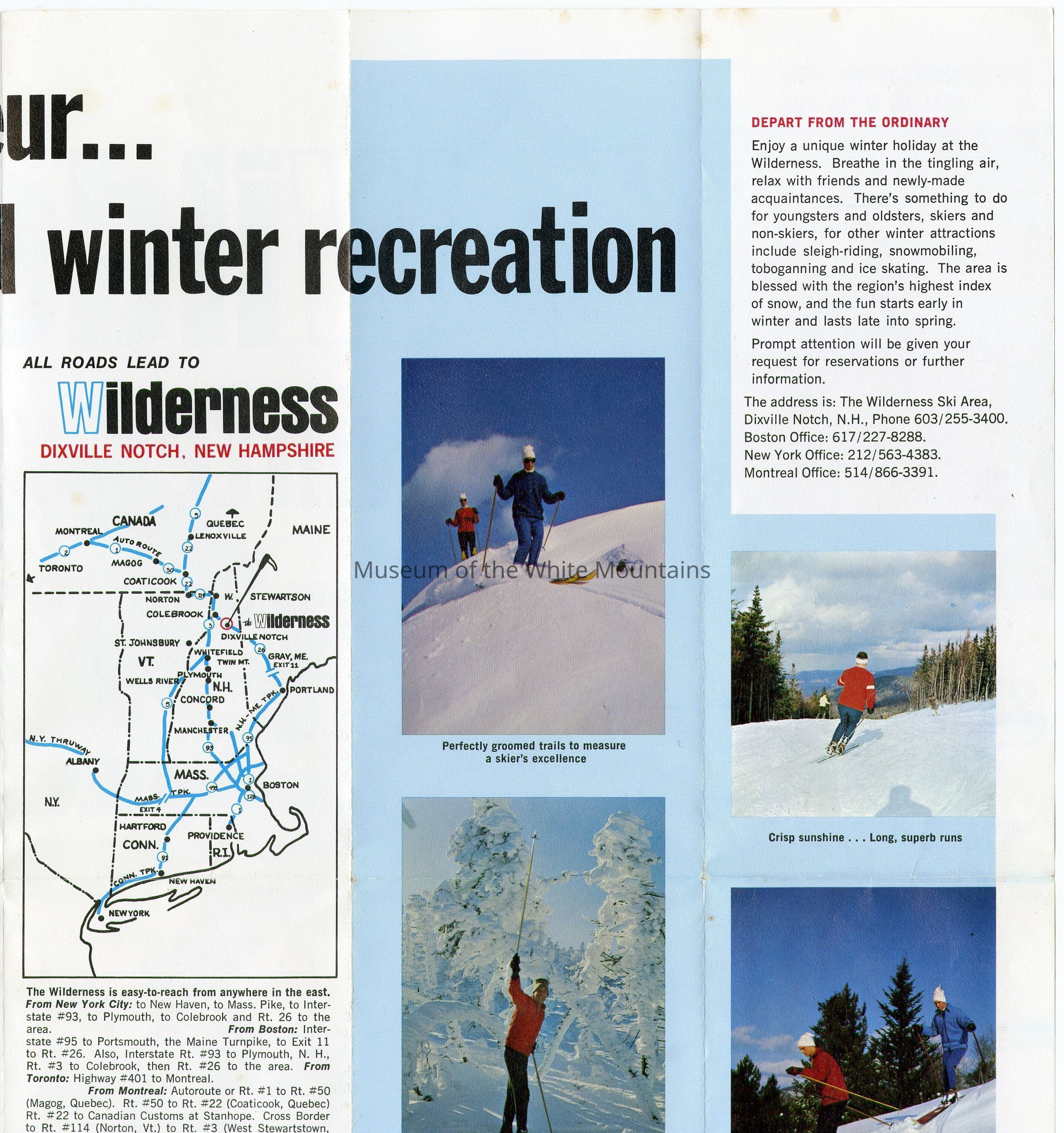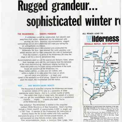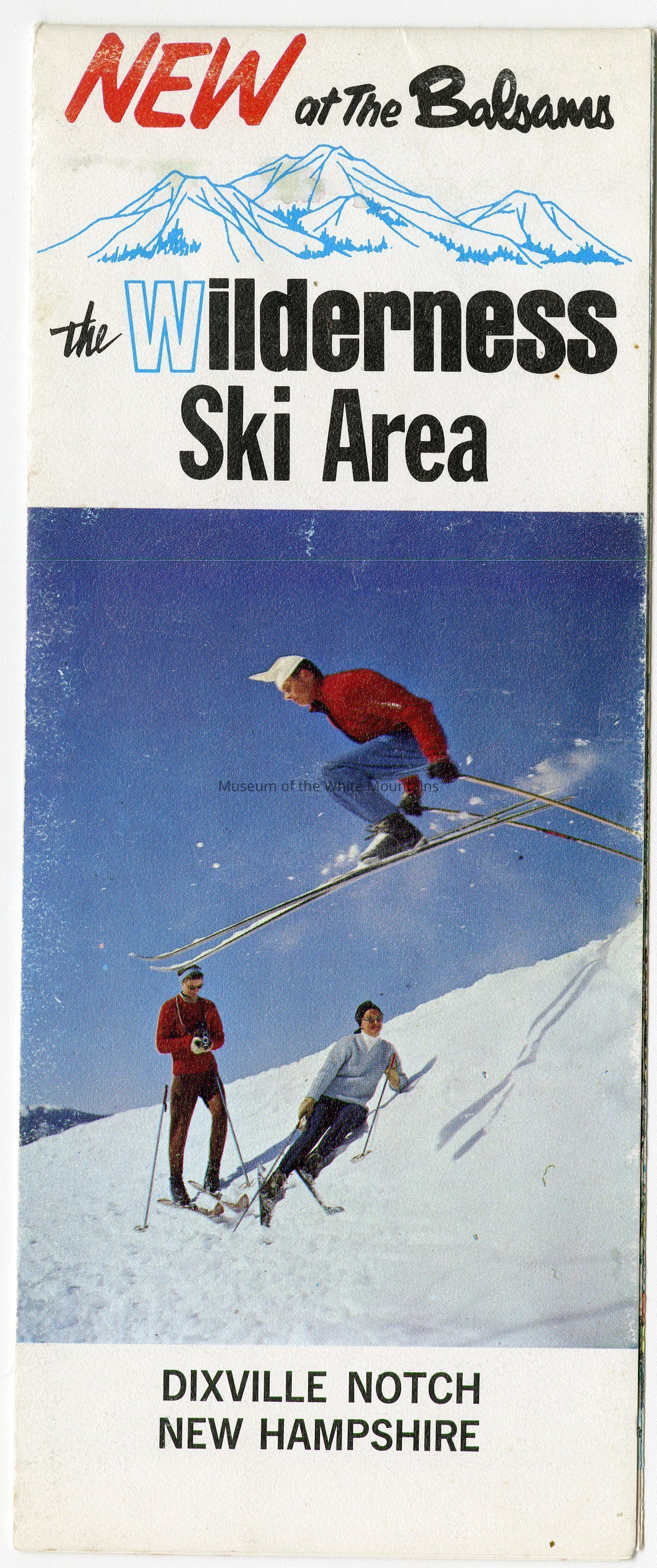Brochure describing the wilderness ski area at the Balsams Winter Resort. Enclosed are sections describing the wilderness and its vast, breathtaking beauty, along with images of the ski trails, the resort, and guests skiing, along with directions to the hotel from New York City, Boston, Toronto and Montreal. On the back is an illustration of the ski area and base lodge with the title"The Wilderness Winter Wonderland."Acquisition
