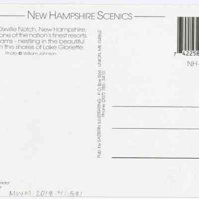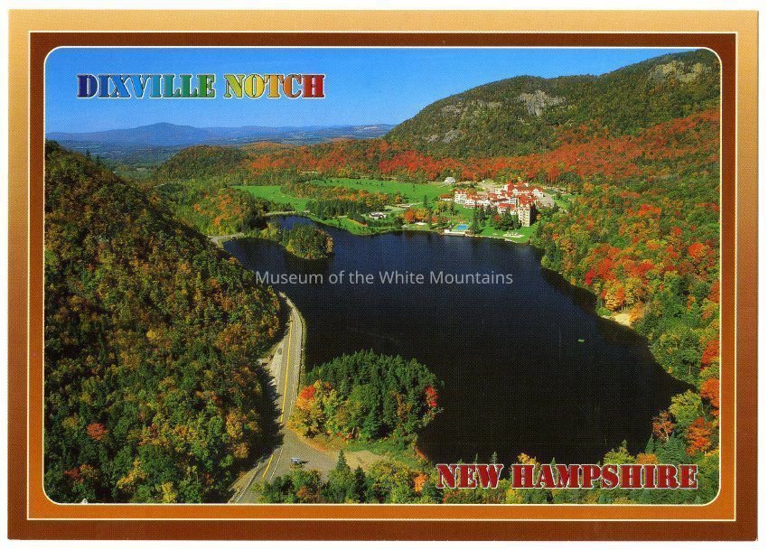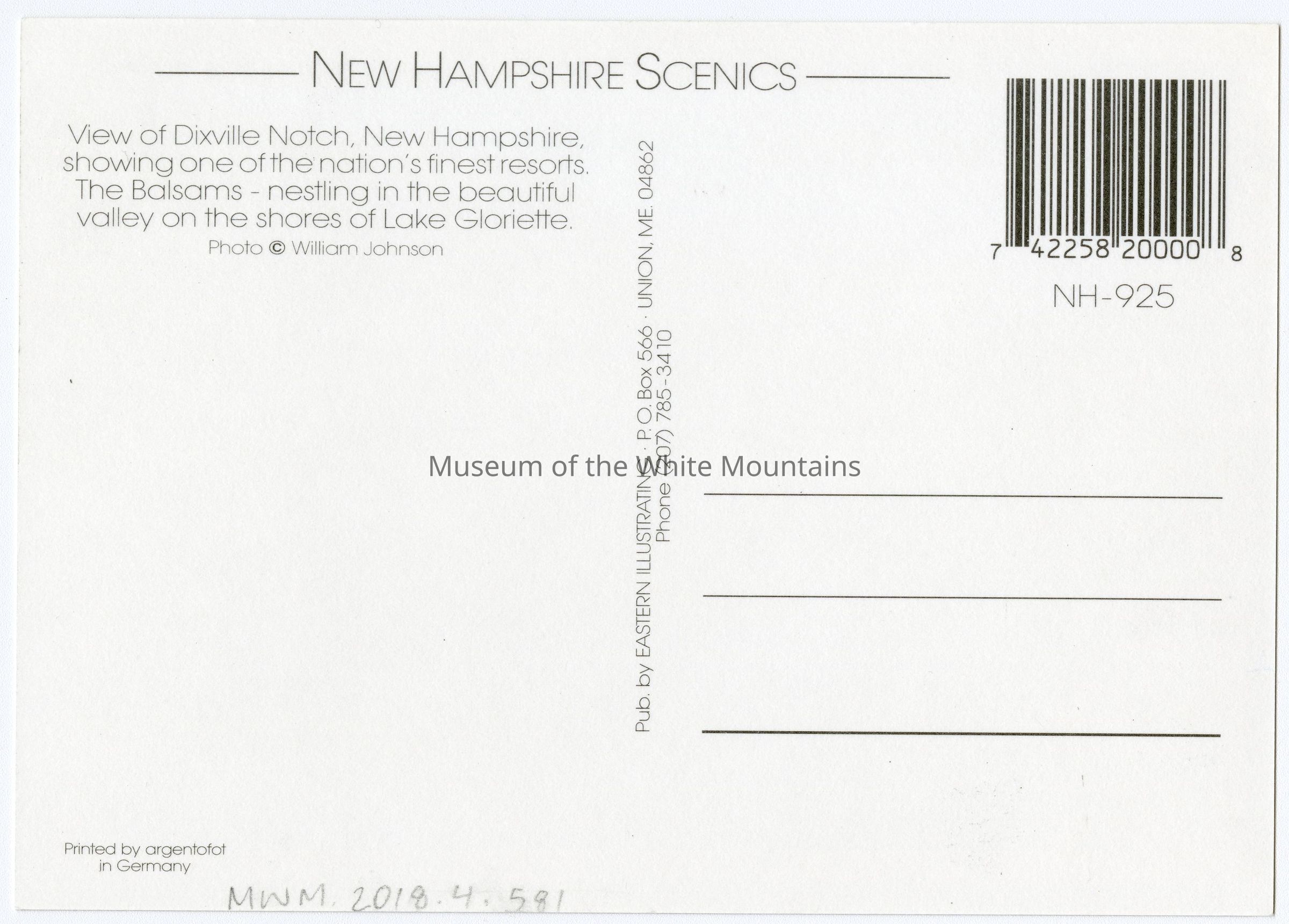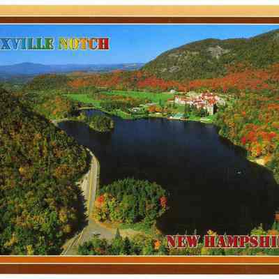 Postcard showing the view of Dixville Notch, New Hampshire, and one of the nations finest resorts. The Balsams- nestling in the beautiful valley on the shores of Lake Gloriette.