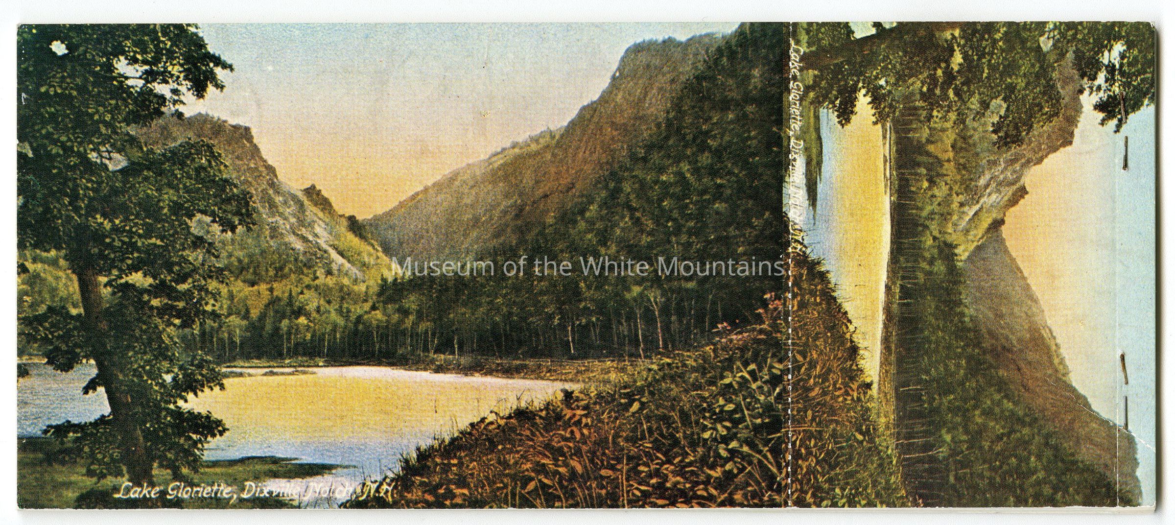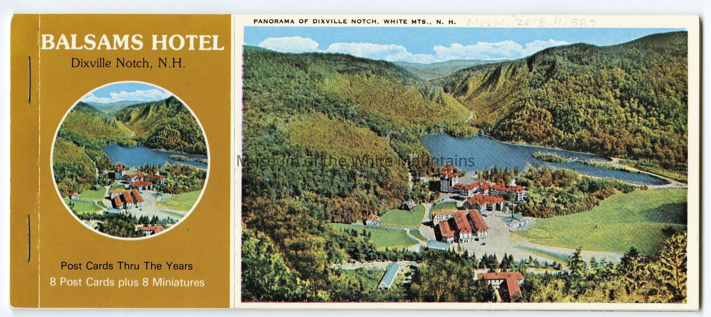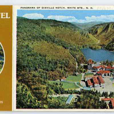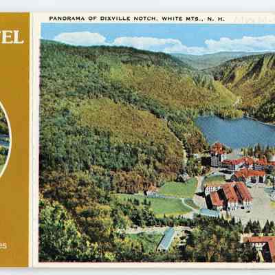 A booklet containing 8 post cards and 8 miniatures depicting images of the hotel, the flume, table rock, webster profile, and other views of the hotel from the notch. Booklet was difficult to scan so only front and back are included in photos.Acquisition