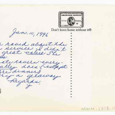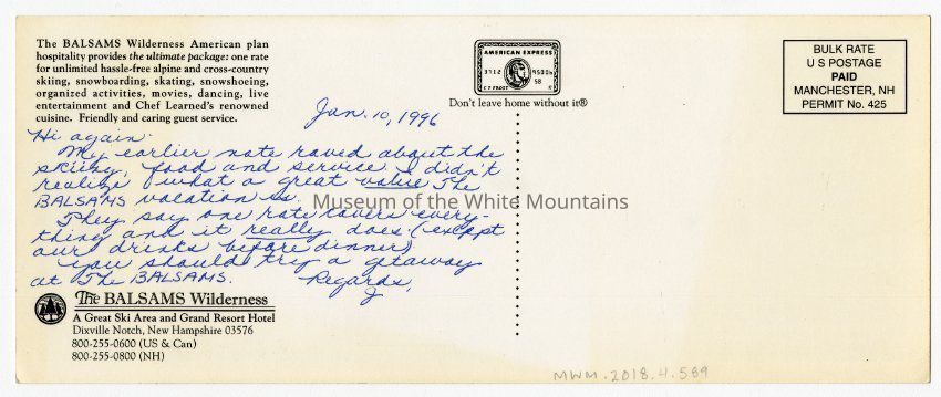 Postcard from the Balsams Winter Resort. On the back there is a message dated from Janurary 10, 1996 that reads "Hi again, My earlier note raved about the facility, food and service. I didnt realize what a great value the Balsams vacation is. They say one rate covers everything and it really does. (except our drinks before dinner). You should try a getaway at the Balsams. Regards, J."Acquisition