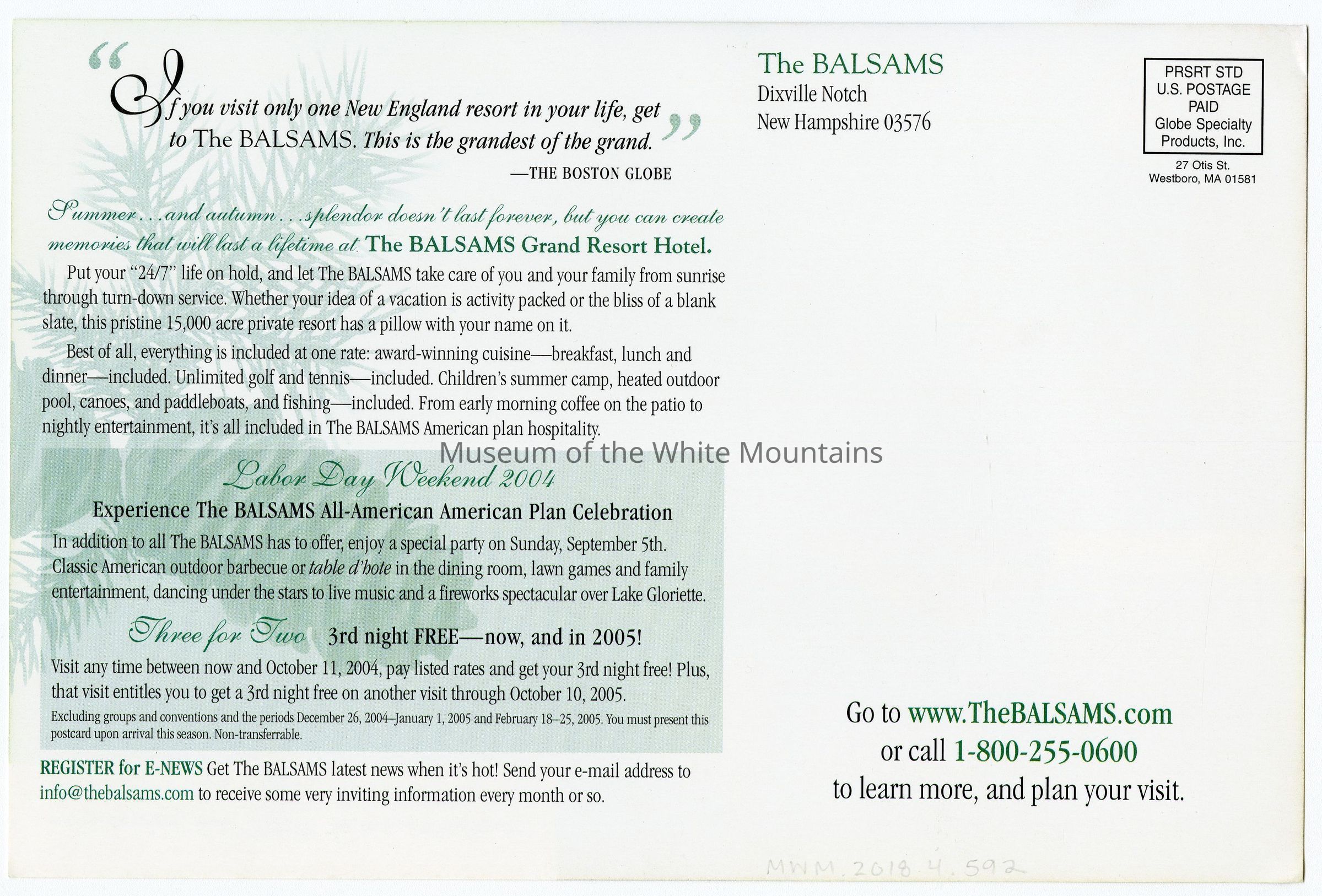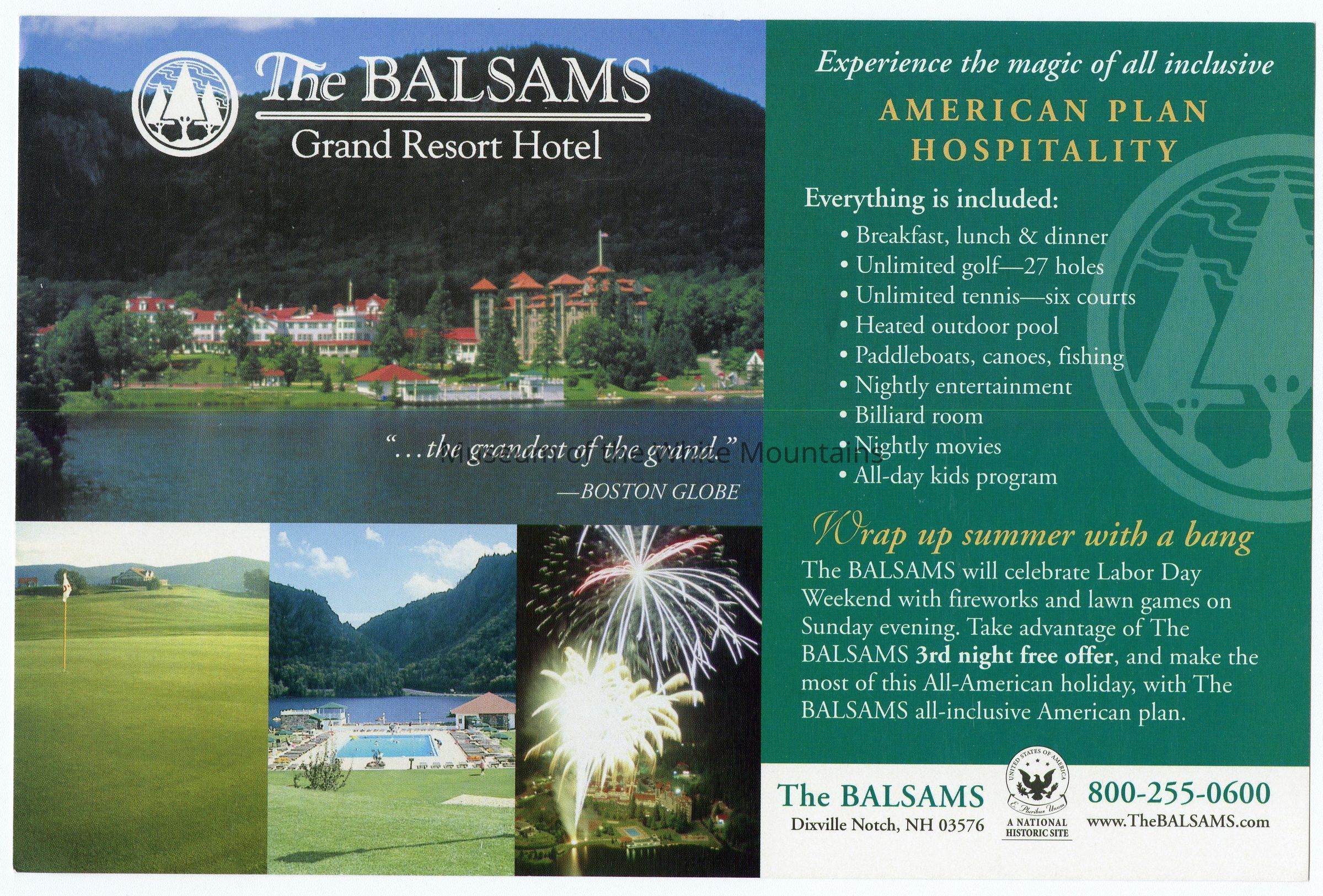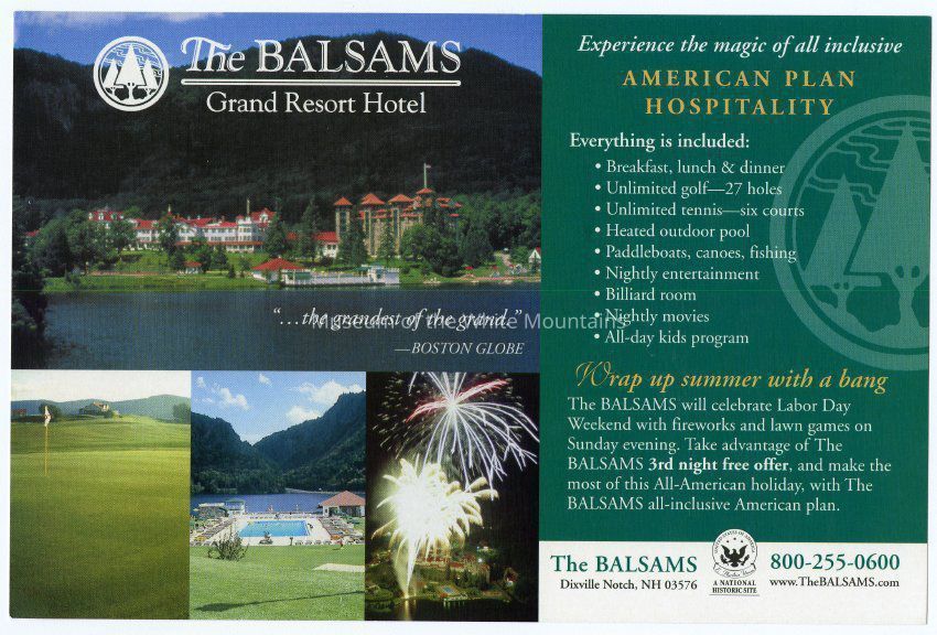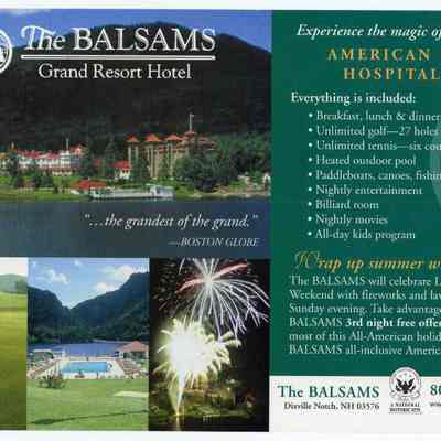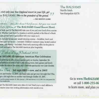 Postcard from the Balsams Hotel. On the front is images of the hotel along with descriptions of the all inclusive ammenities and activities, along with an advertisement for an offer that includes a 3rd nigh free on Labor Day Weekend. On the back is promotional descriptions of the hotel and Labor Day Weekend for 2004 and 2005.